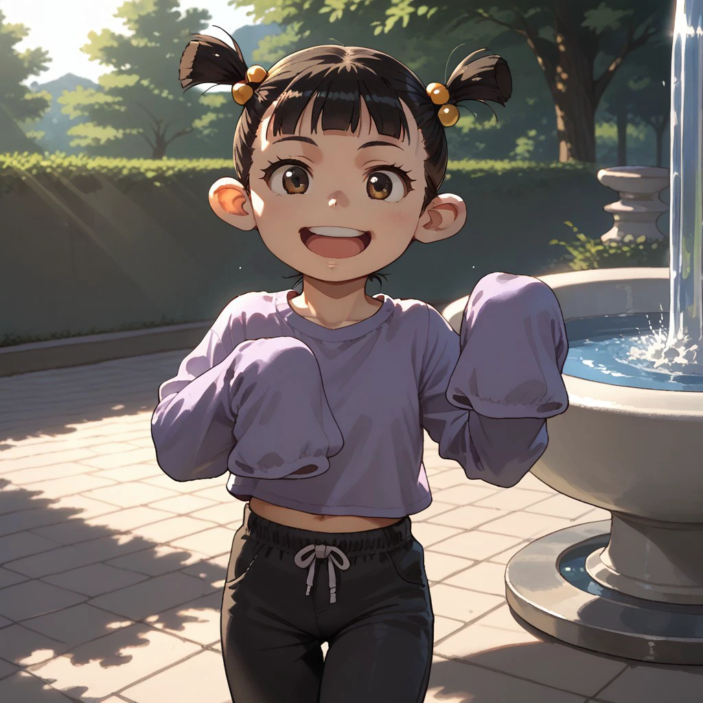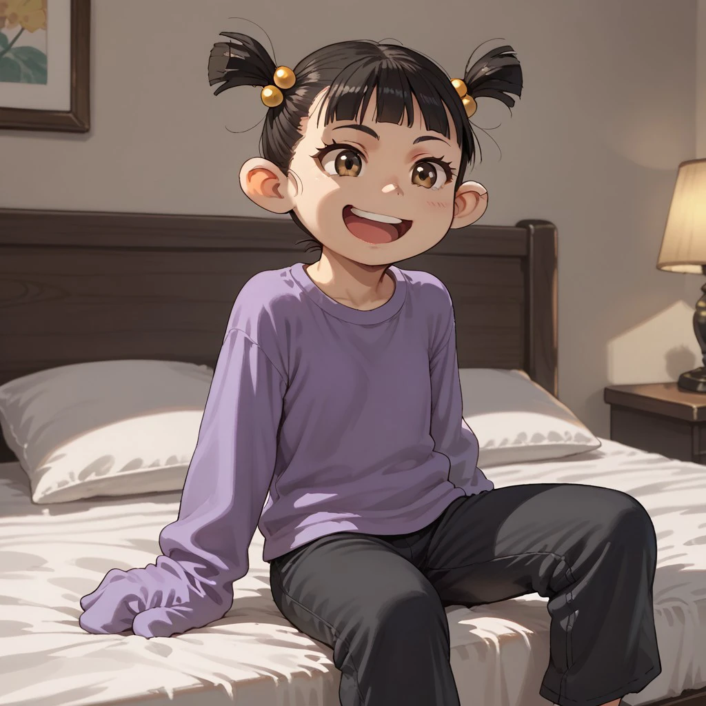 mushi_s, twintails, hair bobbles, black hair, sleeves past fingers, oversized clothes, pants