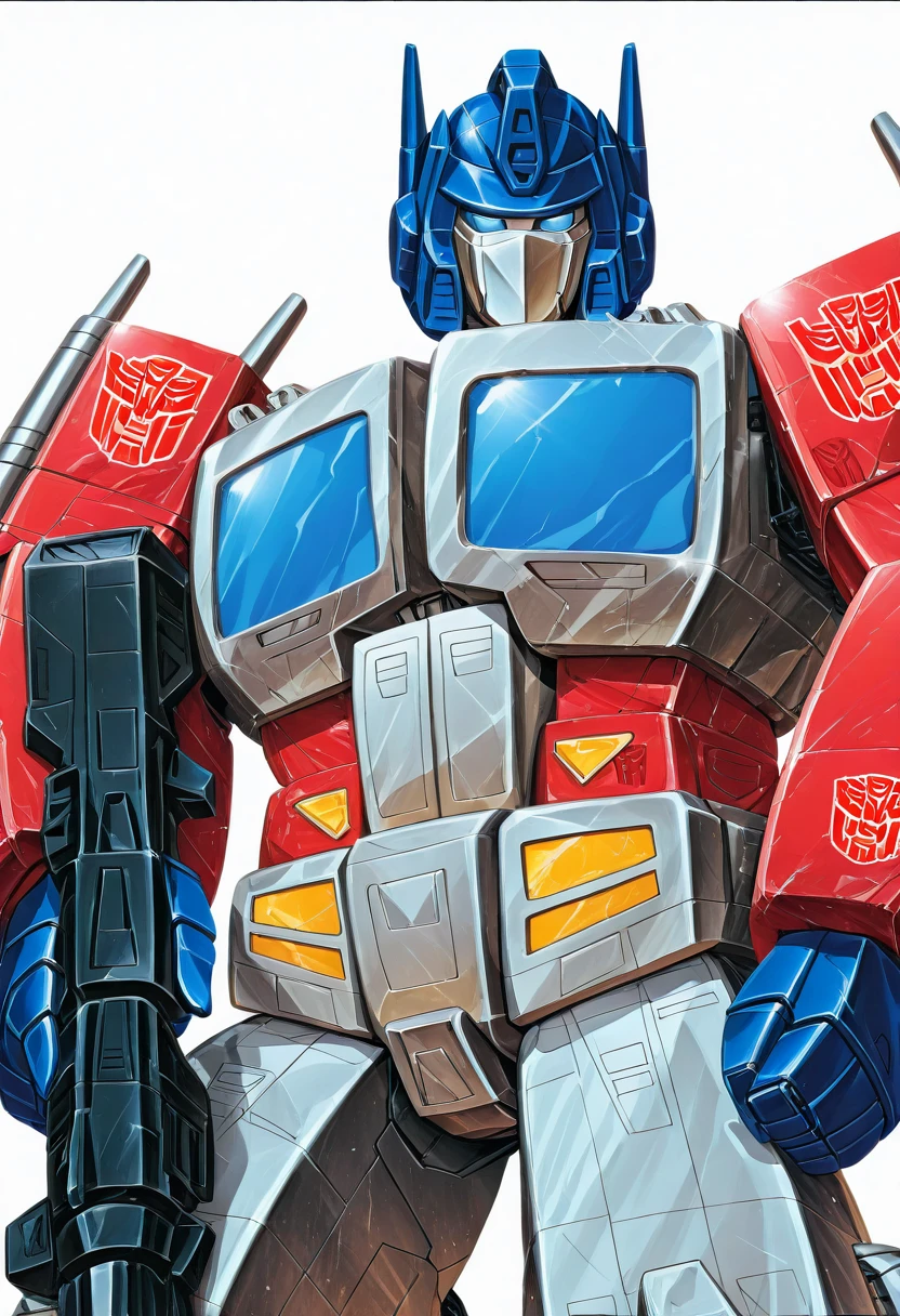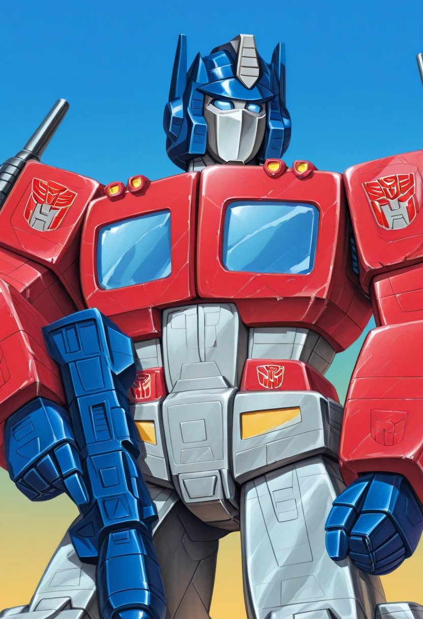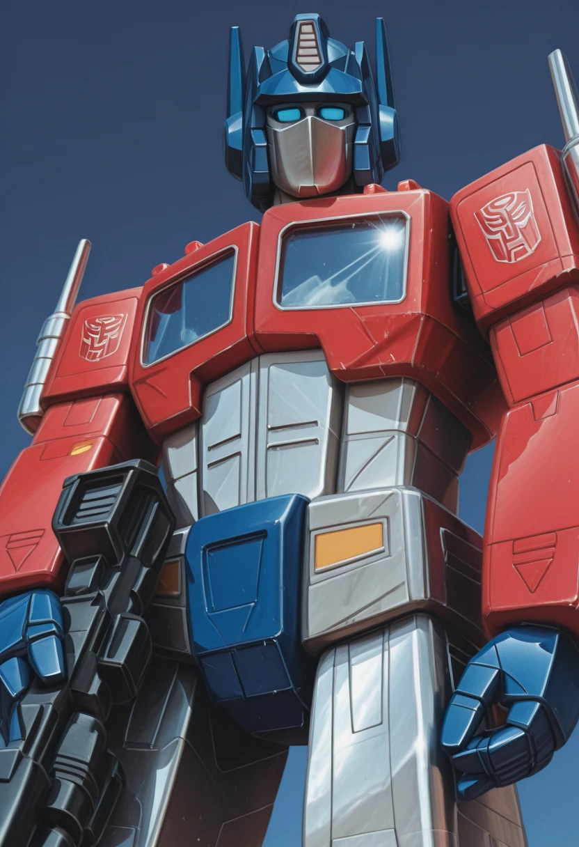 transformers_boxart, 1mecha, transformers, metallic, shiny surface, shiny edges with highlights, reflective surfaces, sun reflection, straight lines, sharp edges, angled details, robot, no humans, solo, science fiction, retro artstyle, 1980s (style), helmet, robot face,