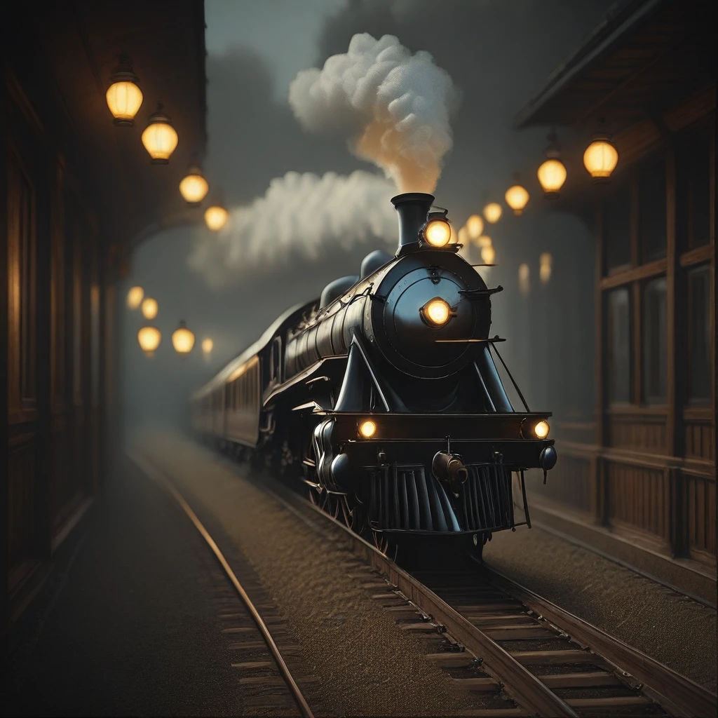 (masterpiece, highly detailed steam locomotive, cinematic HDR lighting, smoky railway station at dawn, golden age of trains, film grain, sepia)