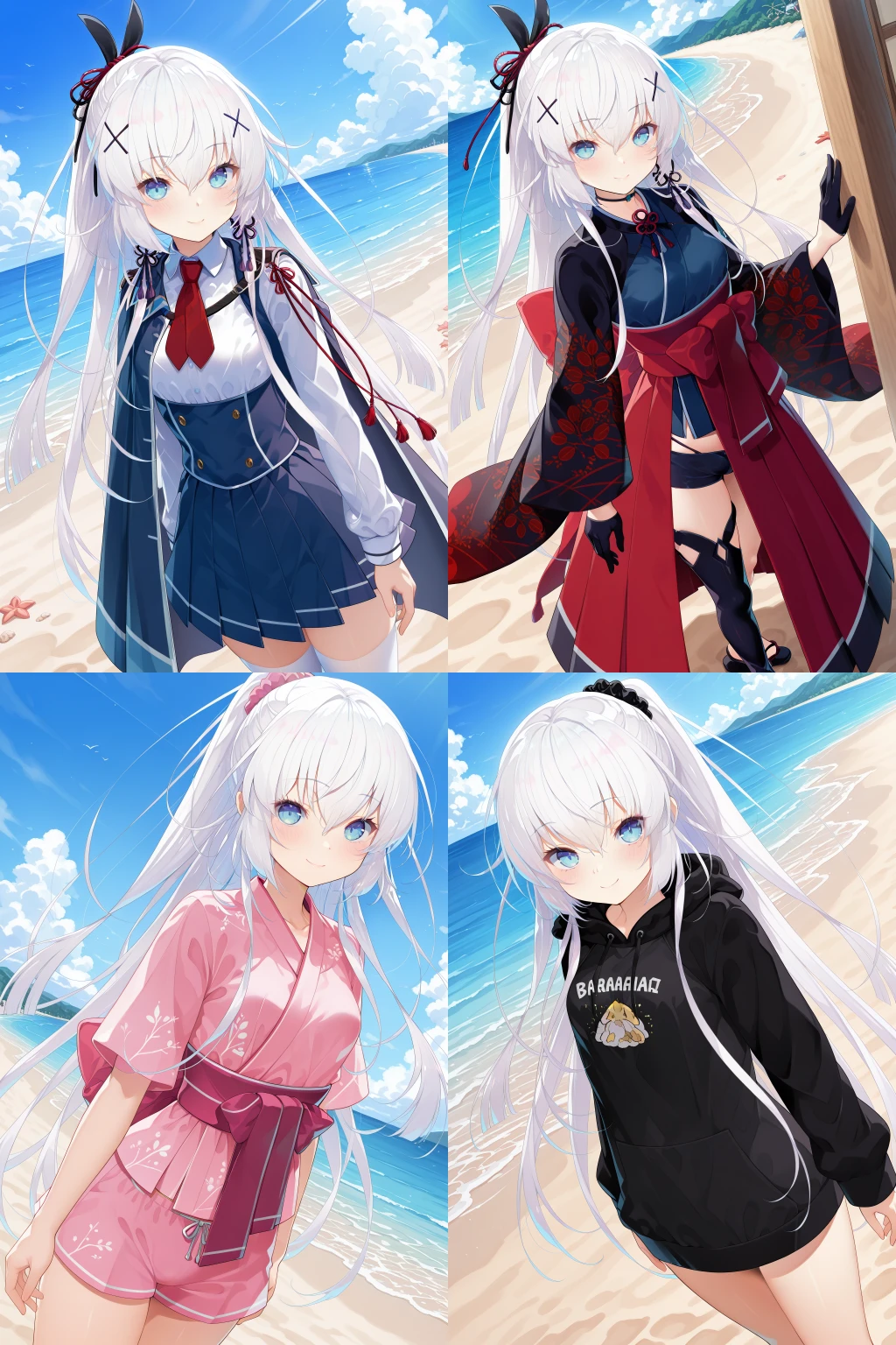 high ponytail,hair bow,black bow,hair ribbon,red ribbon,black ribbon,x hair ornament,tassel,flower knot,school uniform,white shirt,white thighhighs,blue skirt,pleated skirt,long sleeves,red necktie,collared shirt,blue cape,collared cape,buttons,high-waist skirt,miniskirt,white sleeve cuffs,