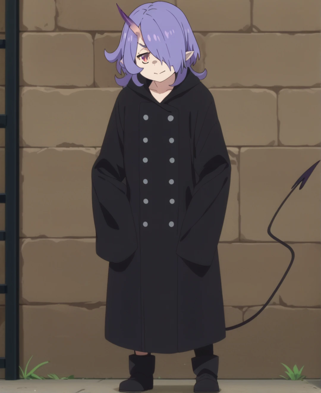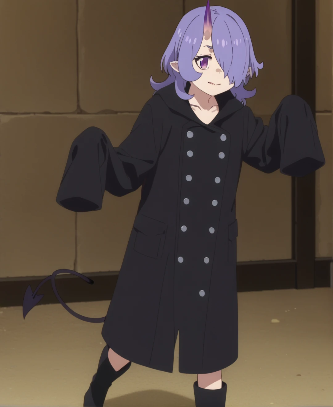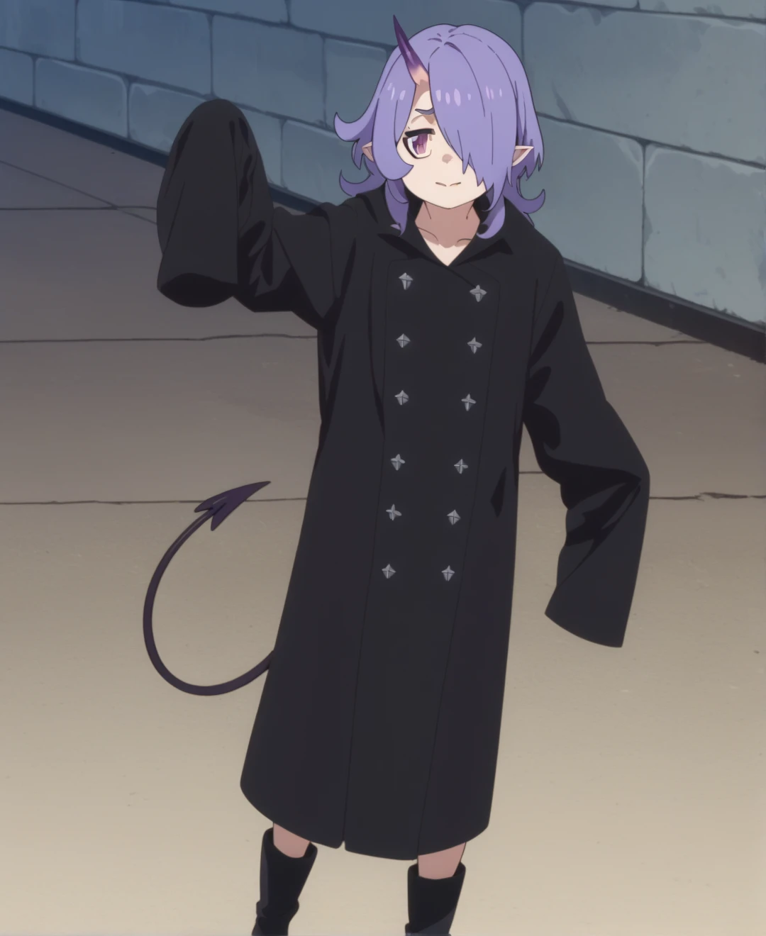 Inki, 1girl, solo, horns, purple hair, tail, hair over one eye, demon tail, purple eyes, demon girl, demon horns, pointy ears, single horn, medium hair, collarbone, slit pupils,