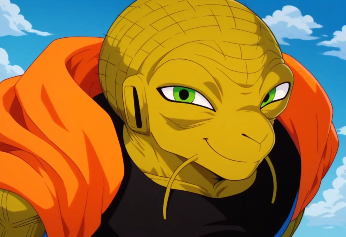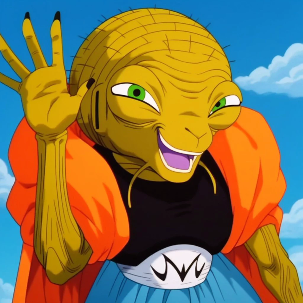 Positive Prompts: BabidiDBZ, alien, green eyes, dark yellow body, dark yellow skin, orange cape, blue gown, black chest piece, belt