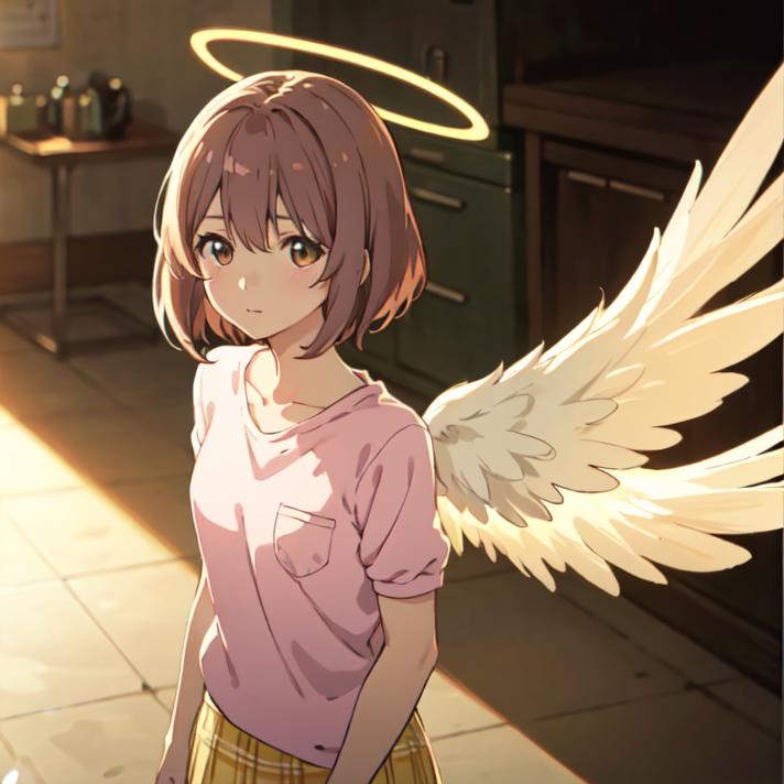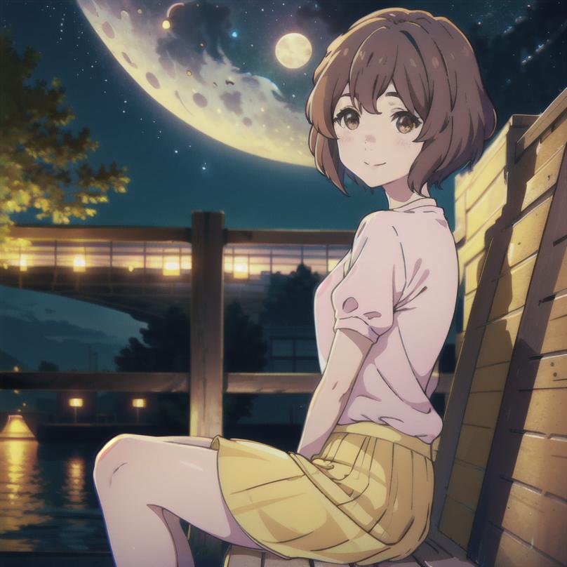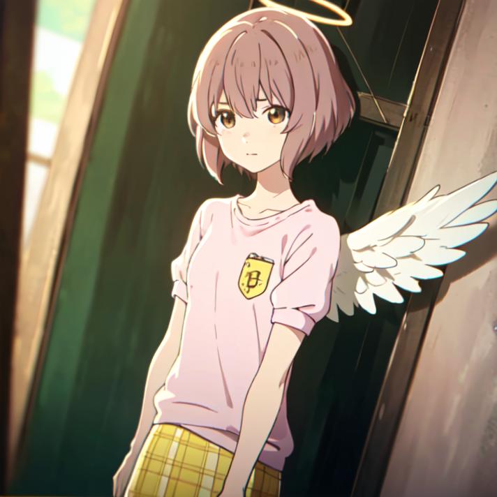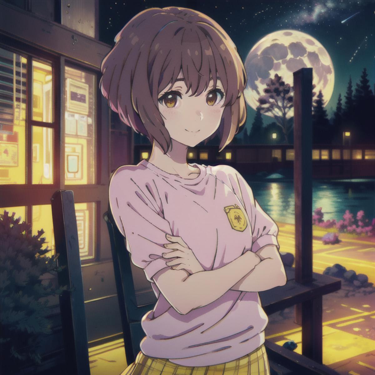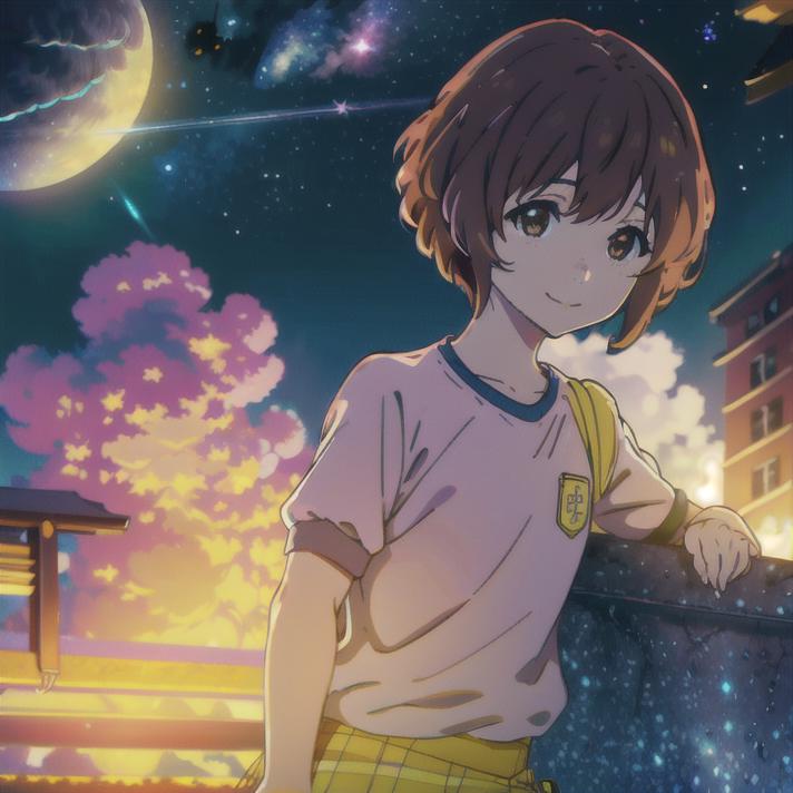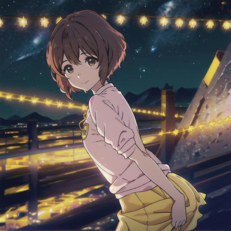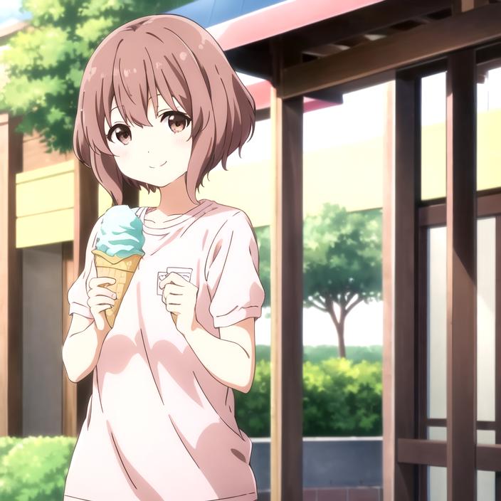 trigger word Nishimiya,1girl,solo,short hair,brown hair,brown eyes,pink shirt , short sleeves ,yellow skirt
