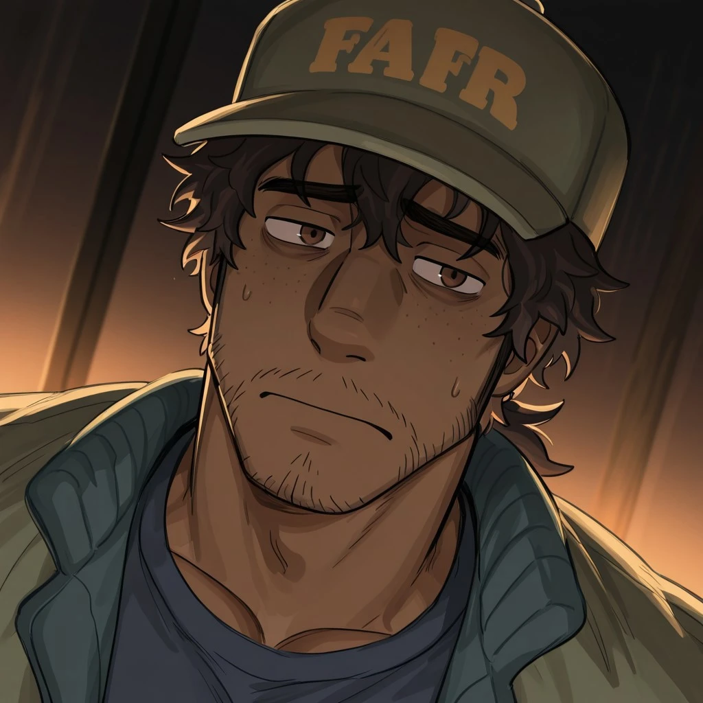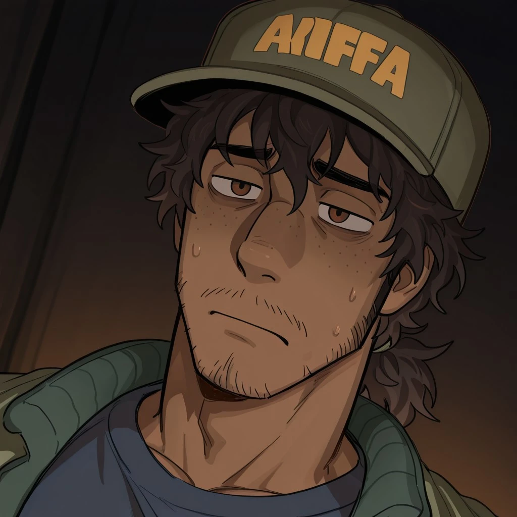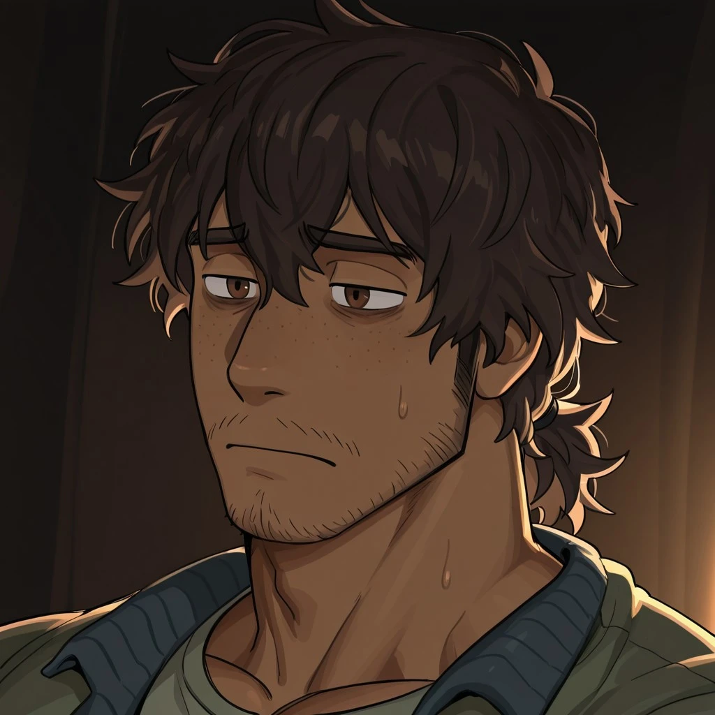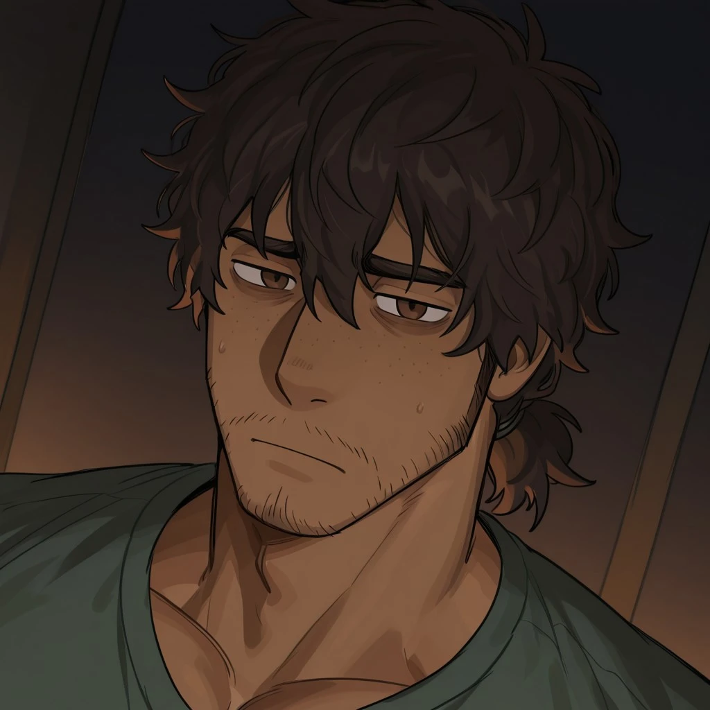 Arnold, brown skinned, dark skin, messy hair, ponytail, dark hair, brown eyes, eye bags, facial hair, male