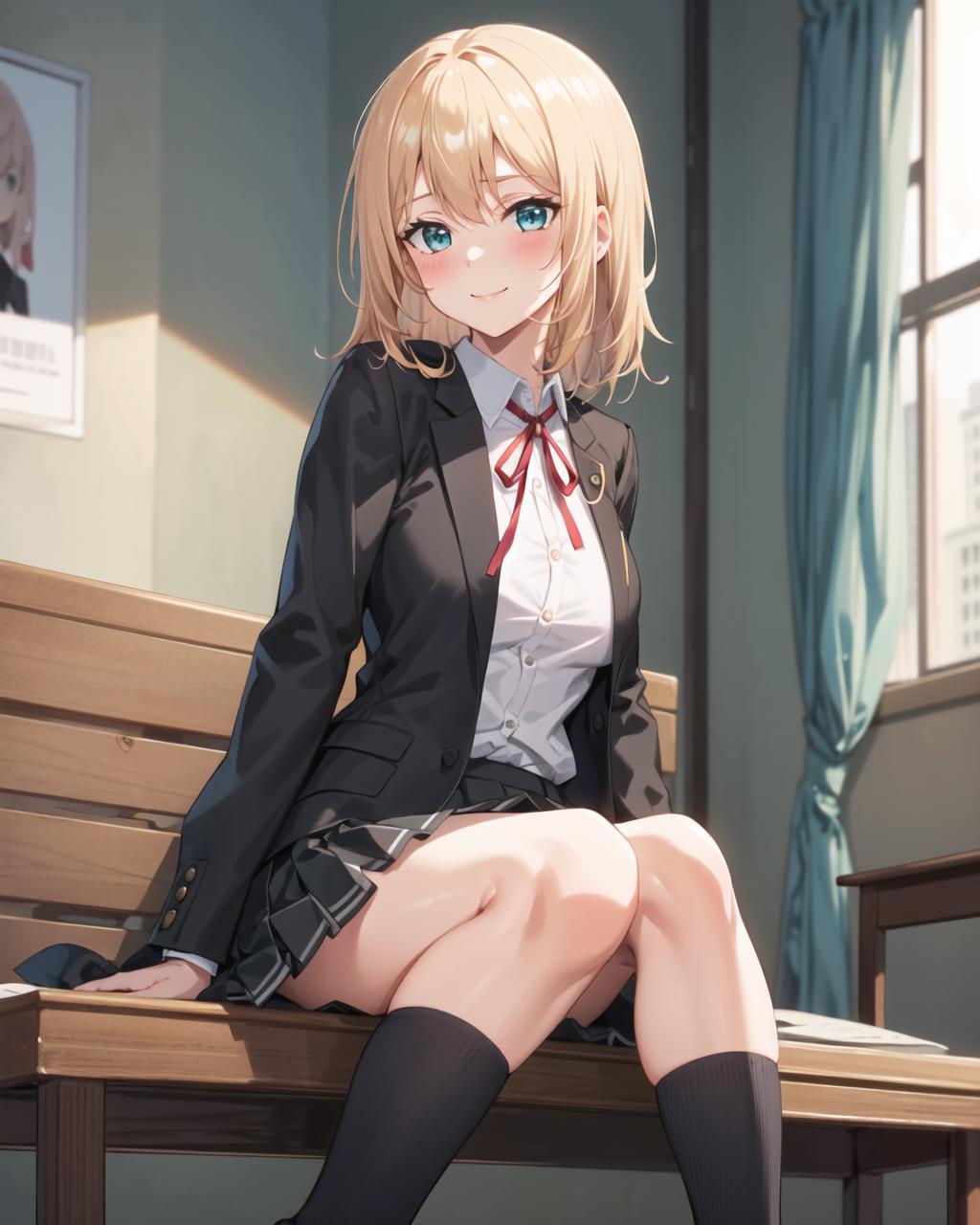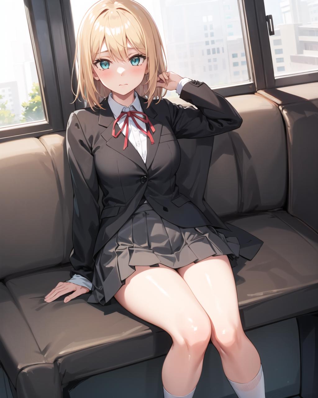 Outfit: school uniform,black jacket,dress shirt,red neck ribbon,grey pleated skirt,miniskirt,white socks