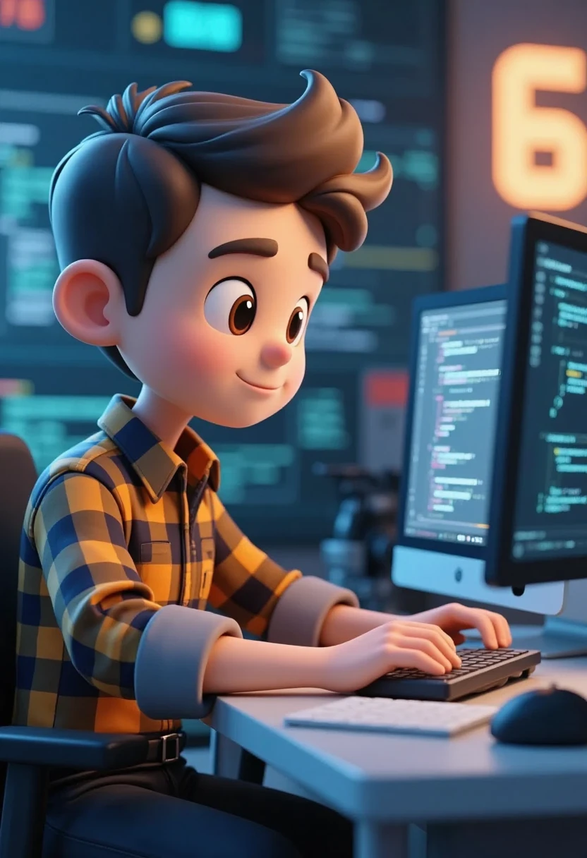 5. Cartoon character representing various occupations, programmer coding, plaid shirt, computer screen, tech - themed 3D.