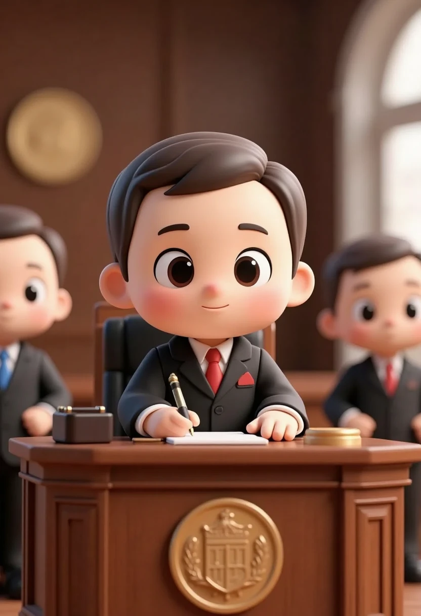 10. Cartoon character representing various occupations, judge at desk, formal attire, courtroom setting, 3D illustration.