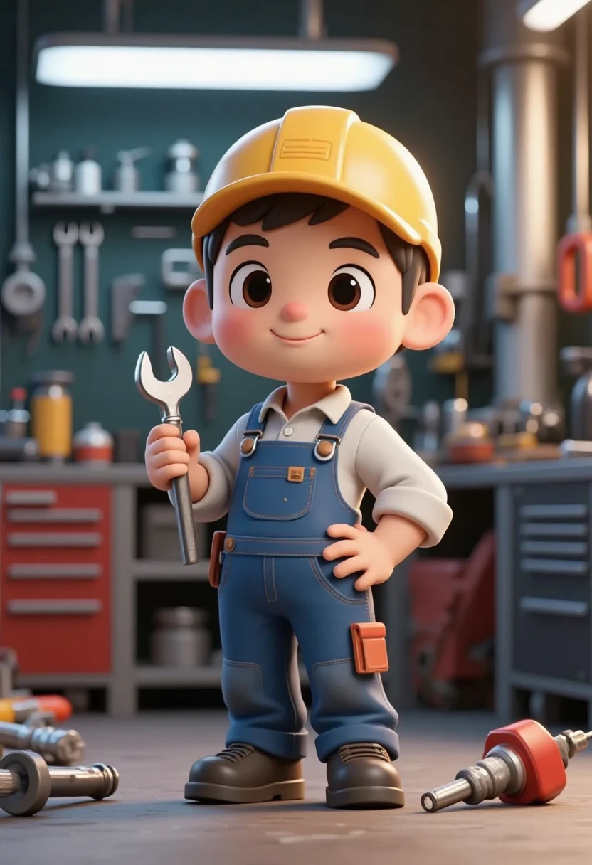 8. Cartoon character representing various occupations, mechanic in overalls, workshop tools, realistic details, 3D cute look.