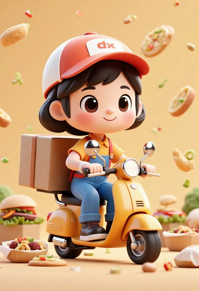 1. Cartoon character representing various occupations, delivery rider on scooter, surrounded by food, bright colors, 3D cute style.