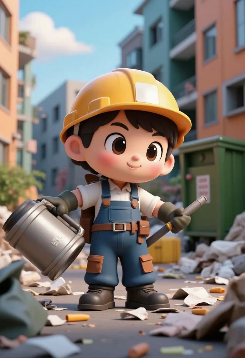 9. Cartoon character representing various occupations, garbage collector, messy environment, work clothes, 3D cartoon art.