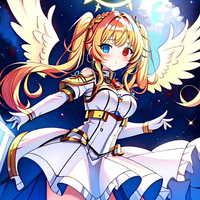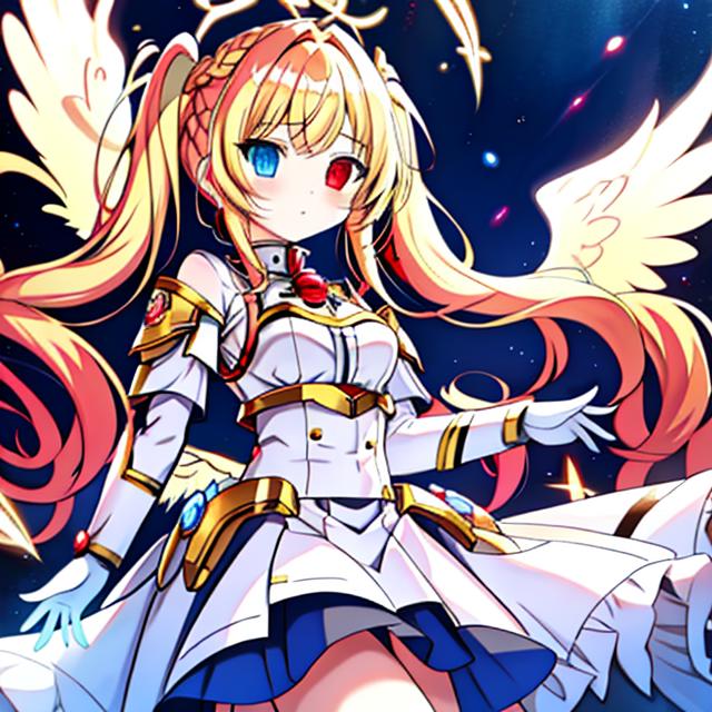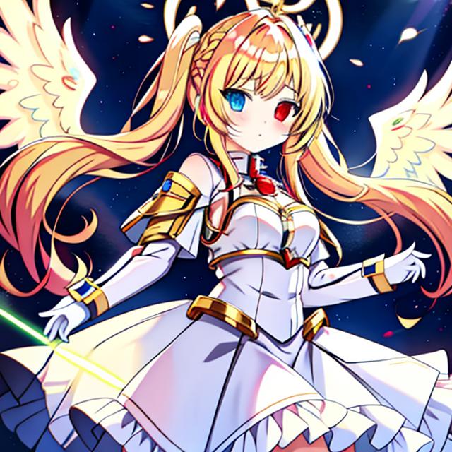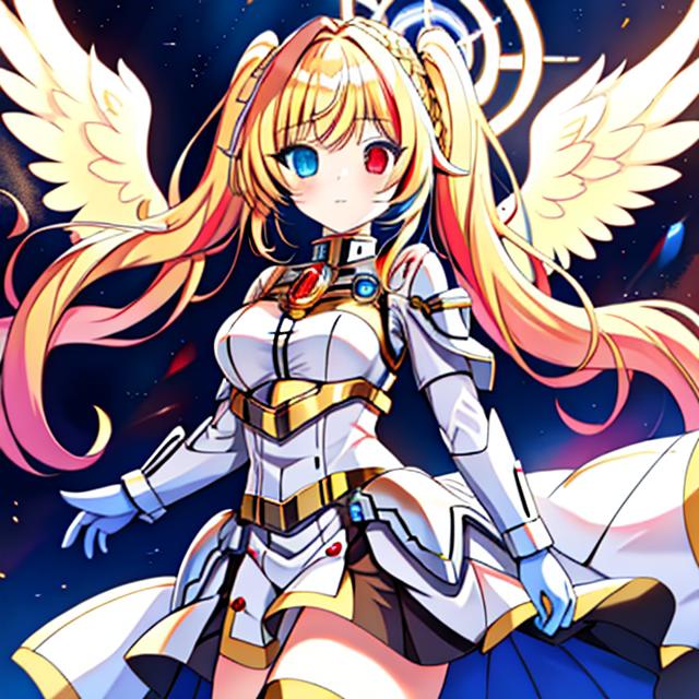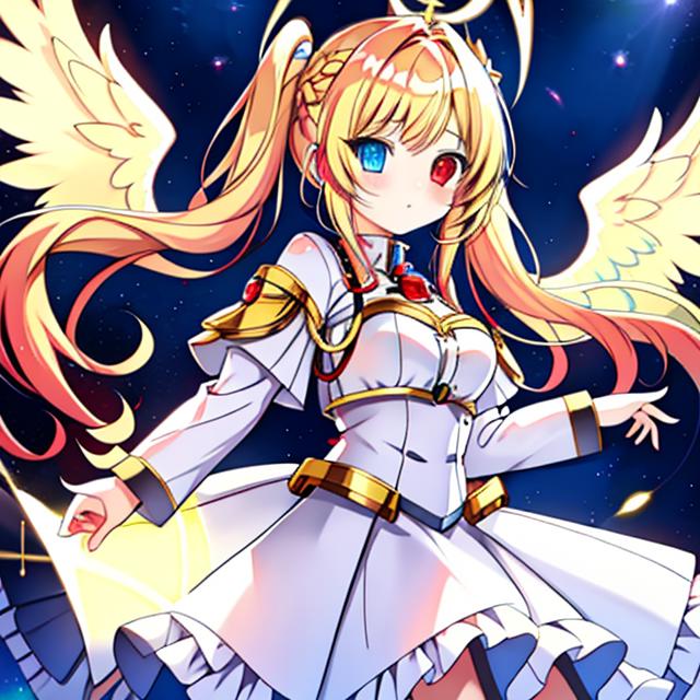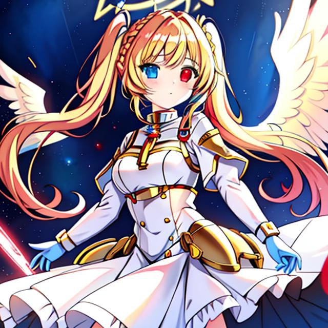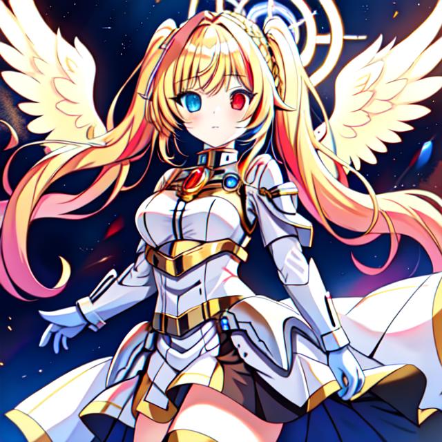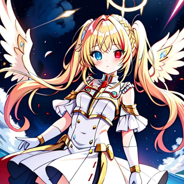 solo, heterochromia:blue eyes left:red eyes right, amco, parted bangs, blonde hair, long hair, twintail, wavy hair,