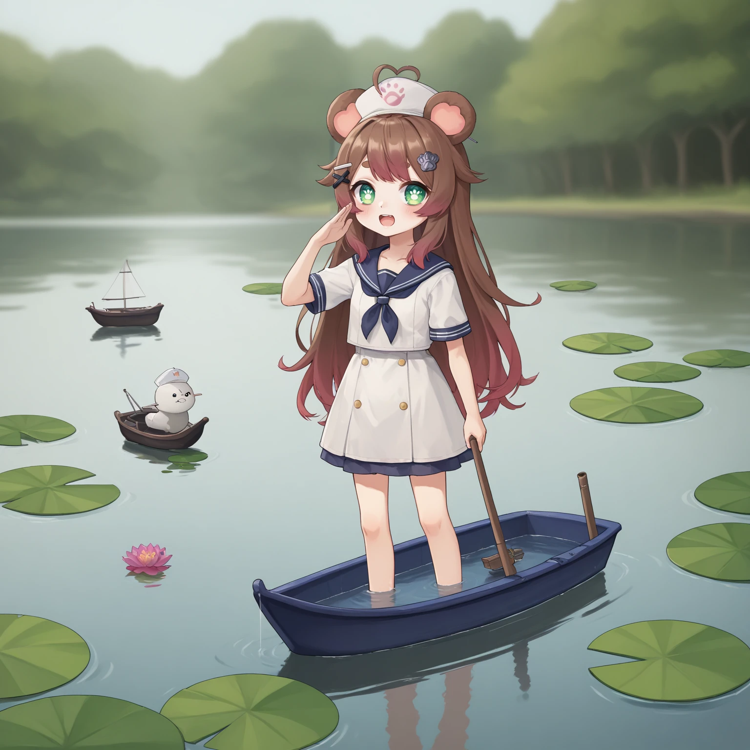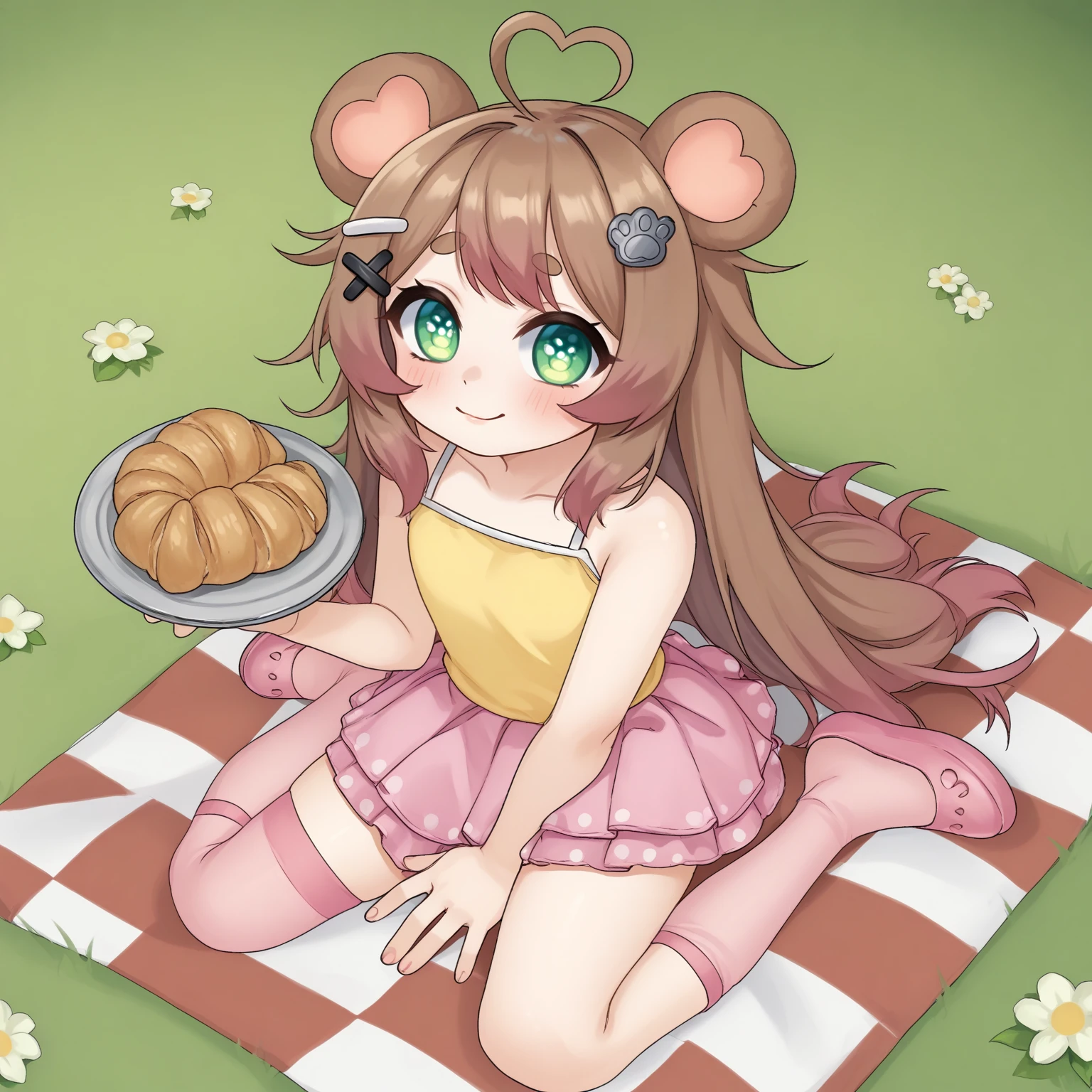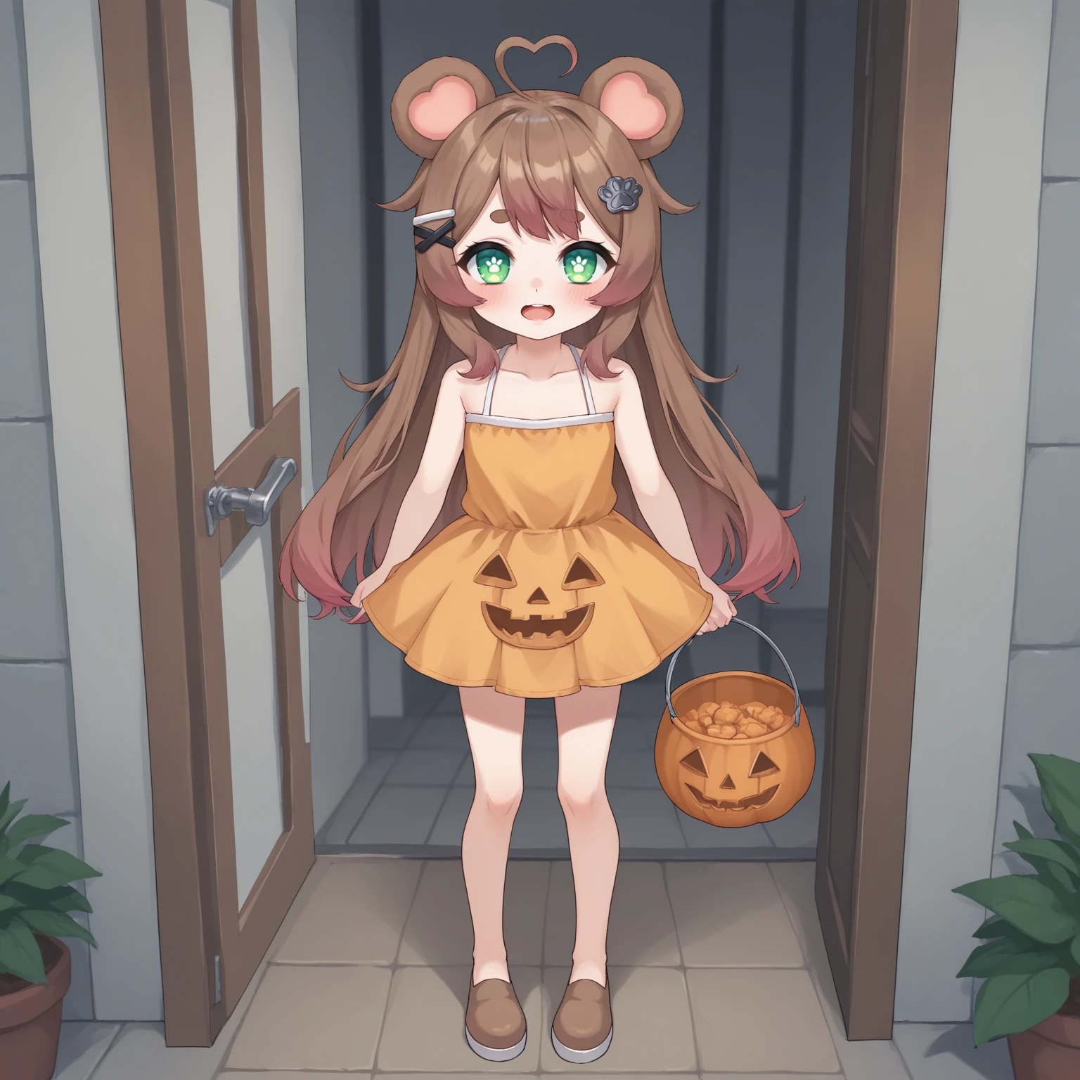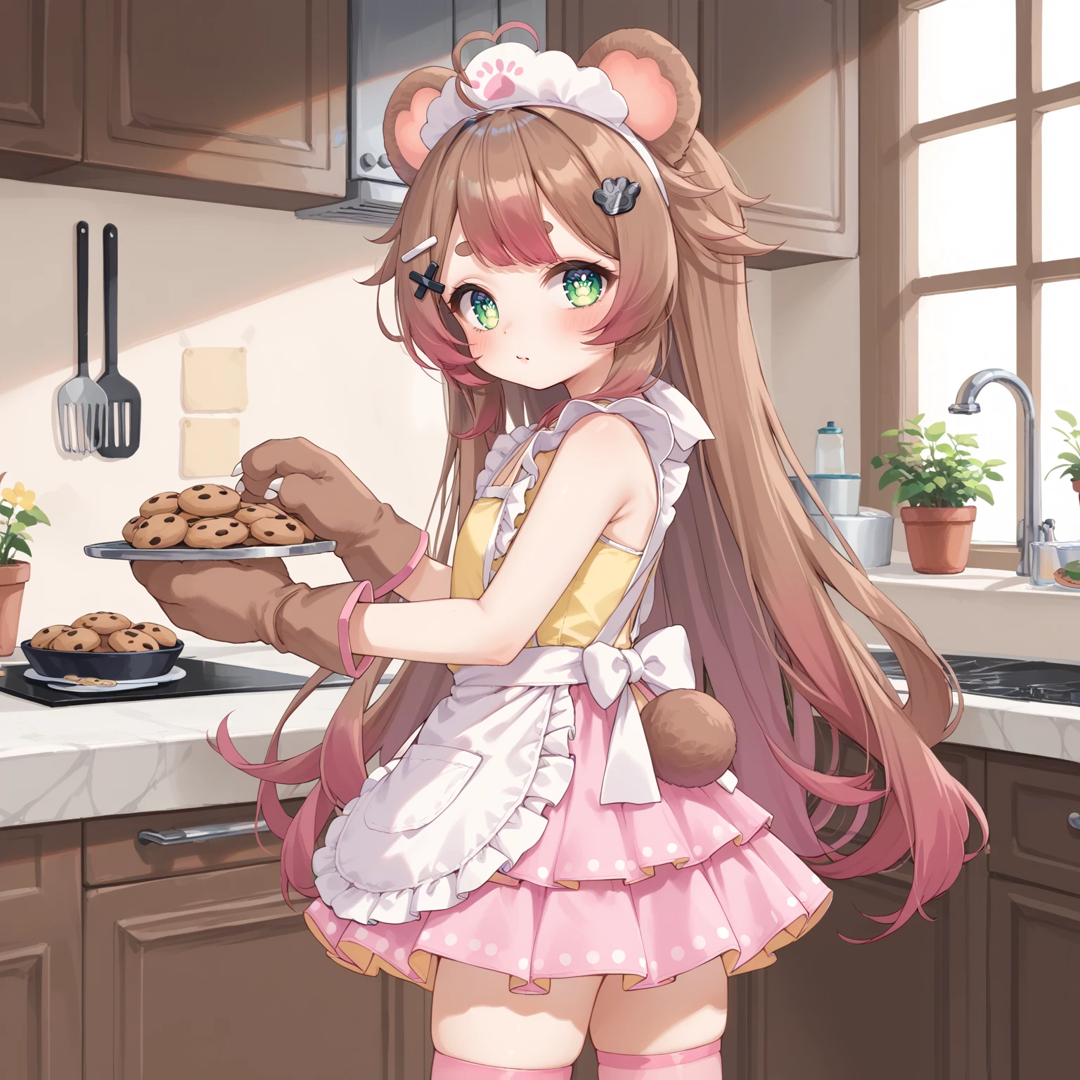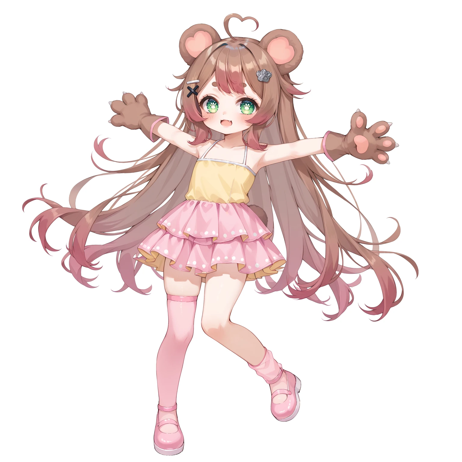 ir1na, animal ears, green eyes, symbol-shaped pupils, brown hair, multicolored hair, hair ornament, hairclip, ahoge, tail, paw gloves, Outfit: