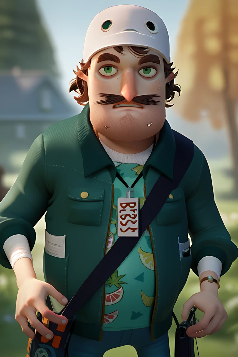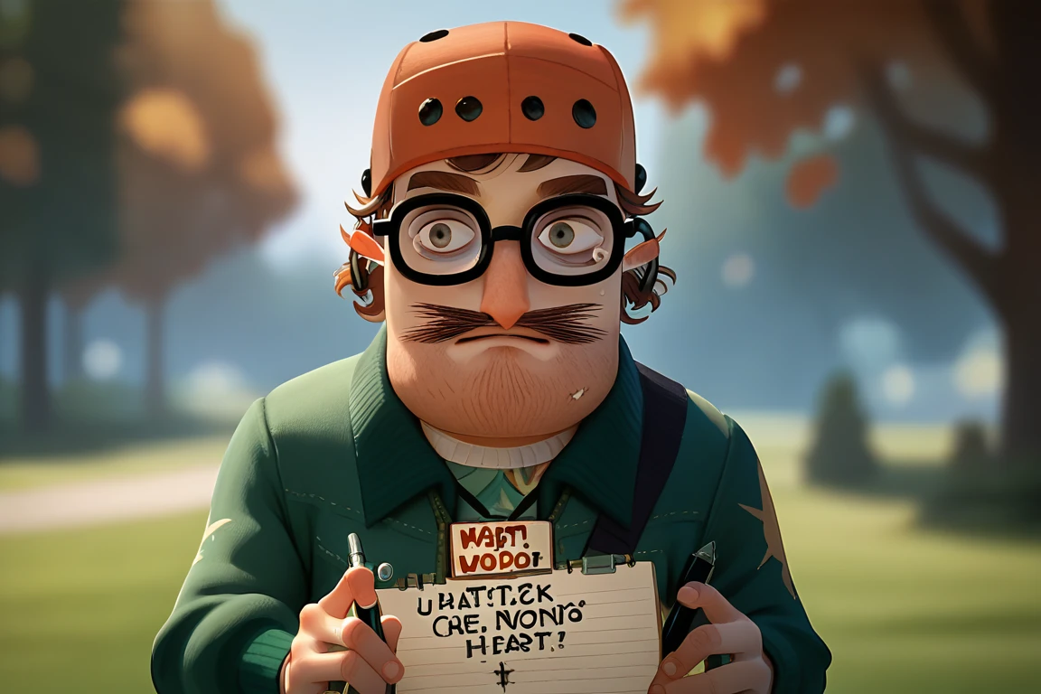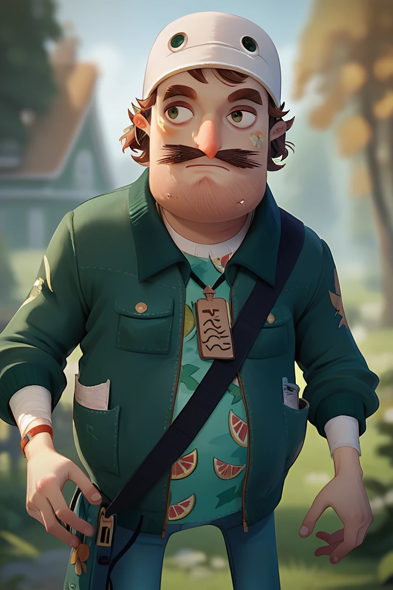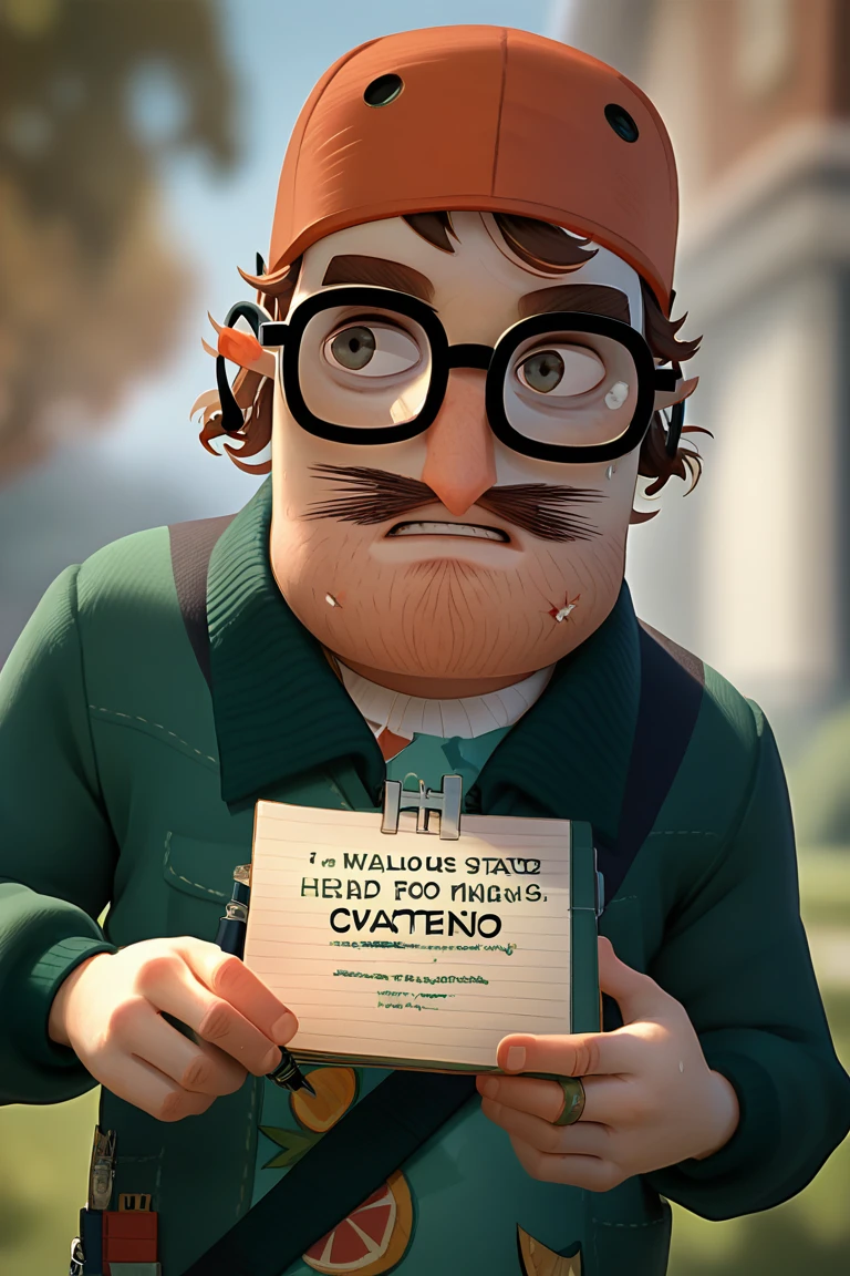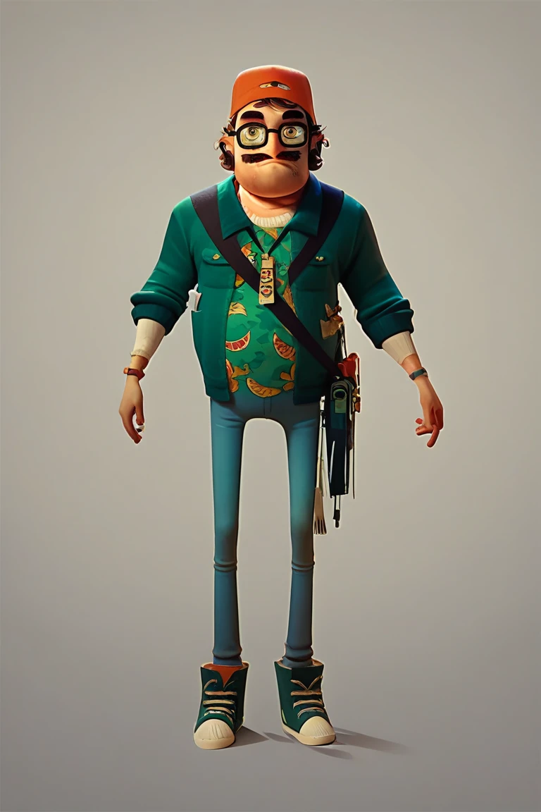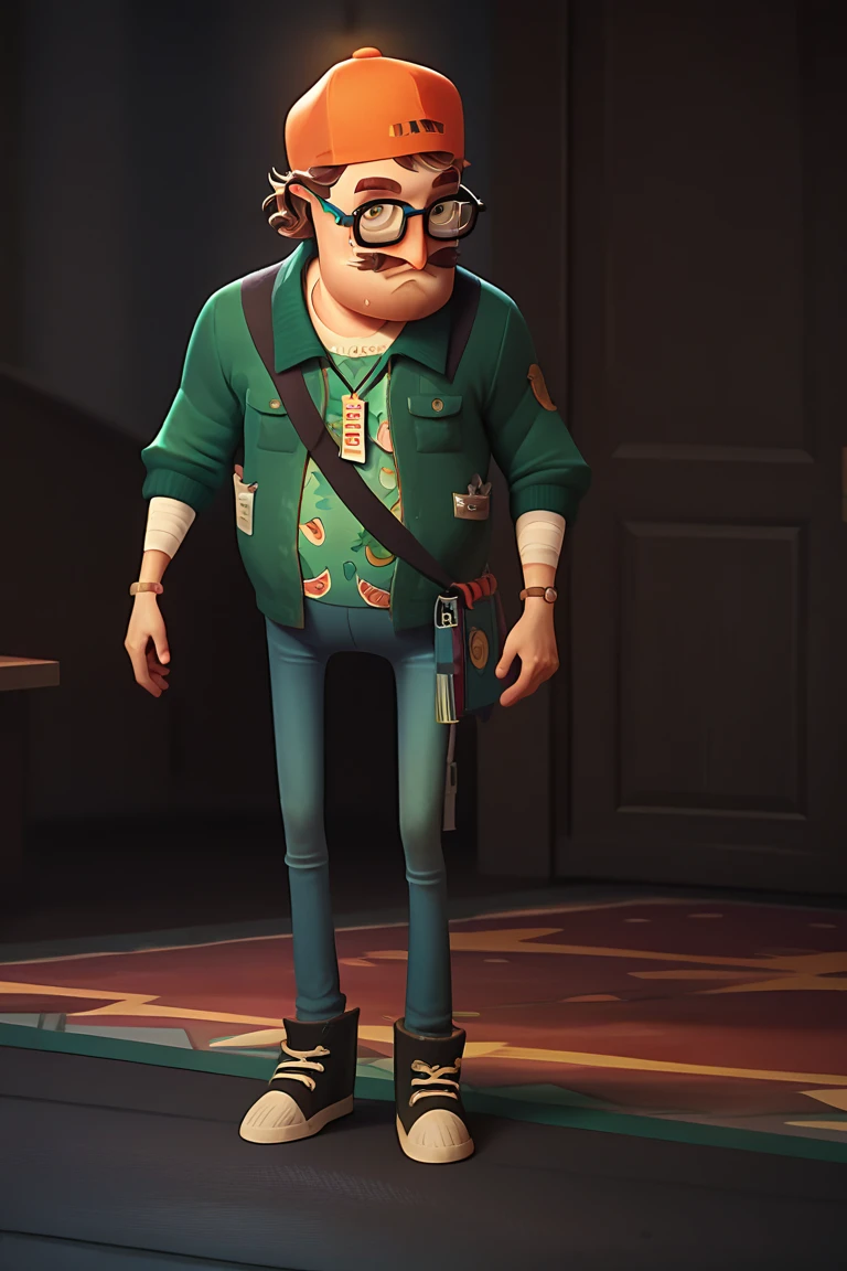 Prompt: quentinhn, man, hat, facial hair, mustache, green shirt, brown hair, open shirt, glasses, (pants,thin legs)(mention the legs will cause it to be full body)