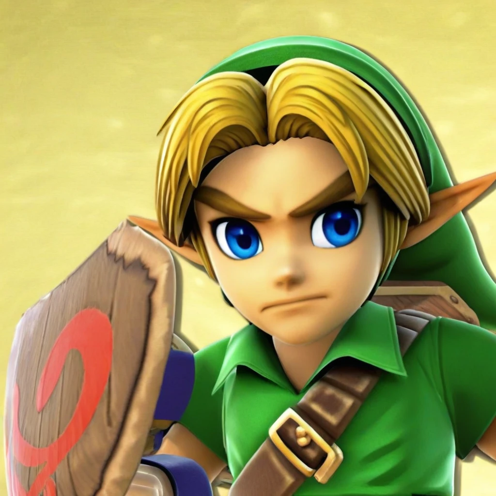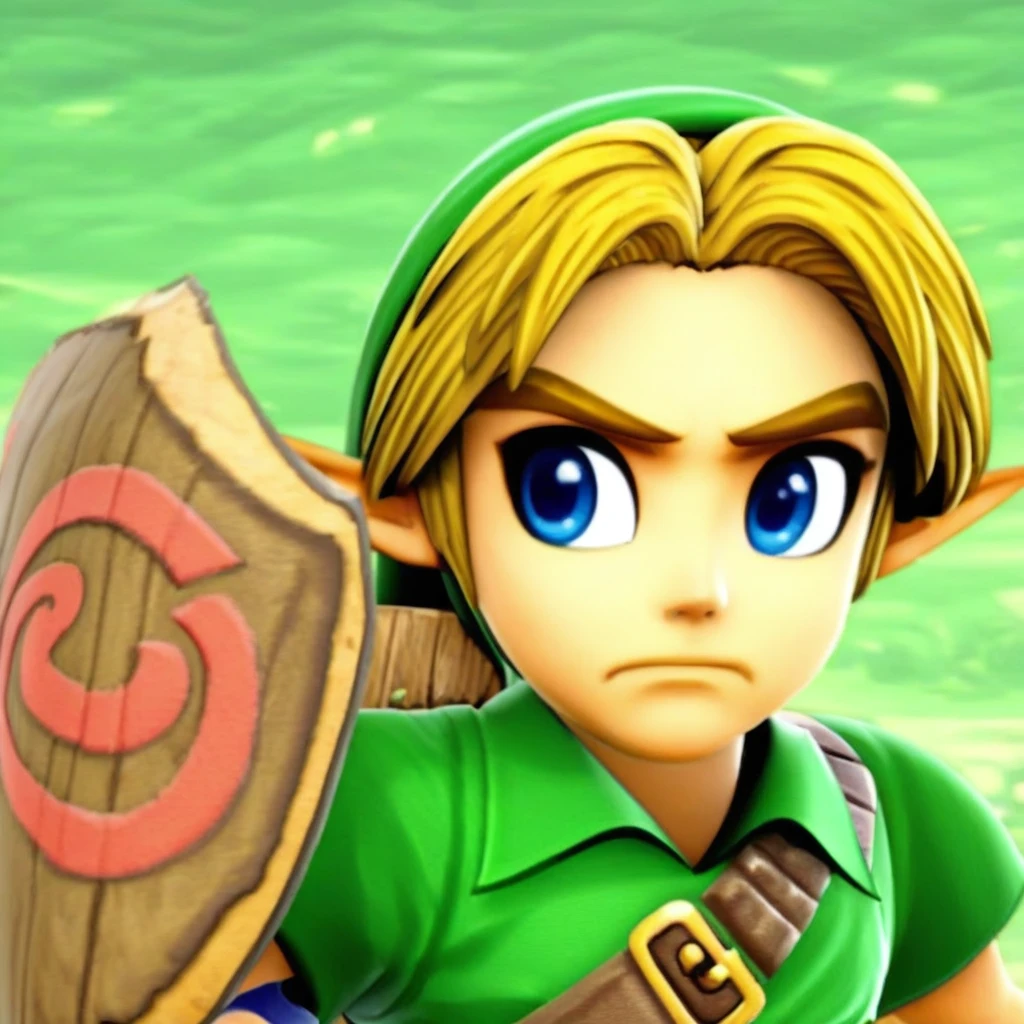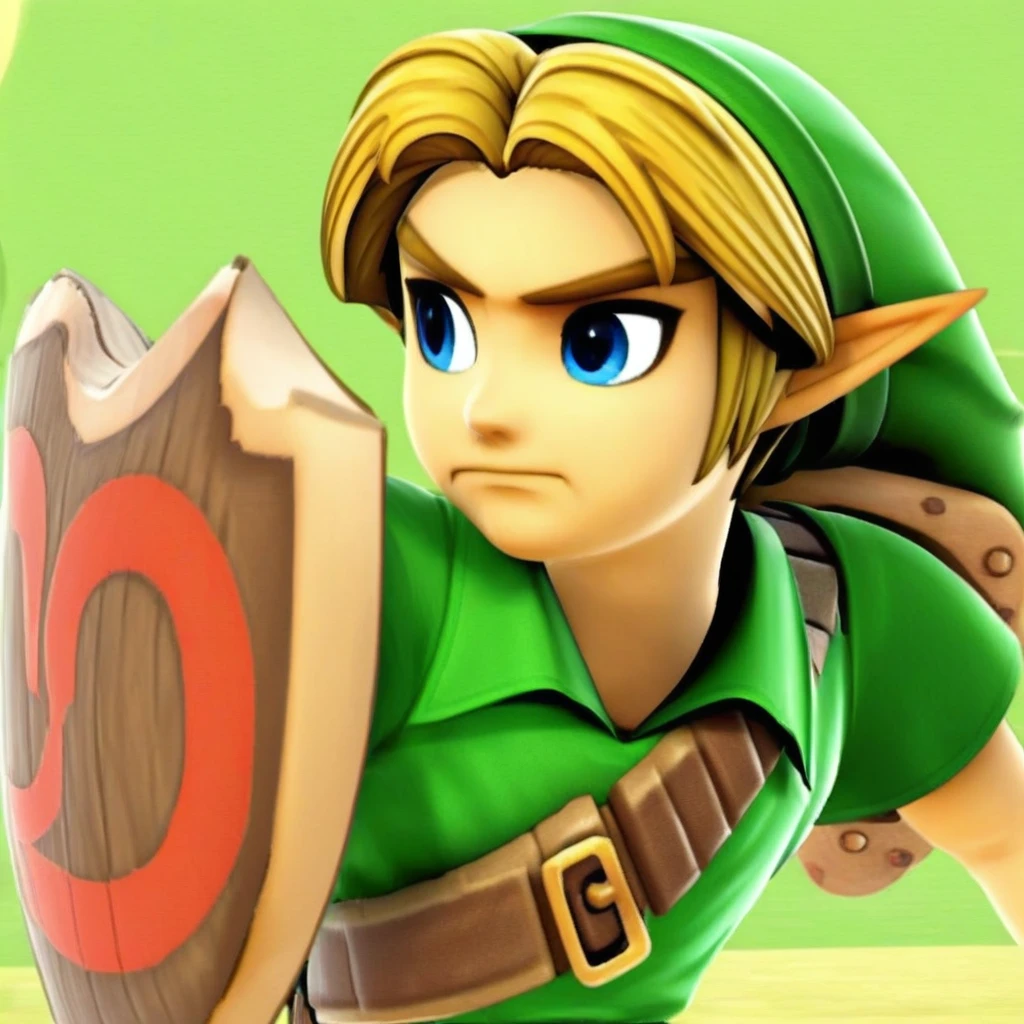 Link(OoT), blue eyes, blonde parted hair, bushy eyebrows, pointy ears, long green hat, green collar tunic, short sleeve, sword holster on his back, holster strap around body, brown belt, gold buckle, exposed legs, long brown boots, holding wooden shield