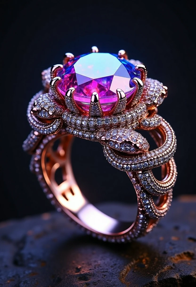 Fantasy-style ring designs, a multicolored gem cluster at center, ring band like intertwined magical snakes, in a mysterious, ancient temple.