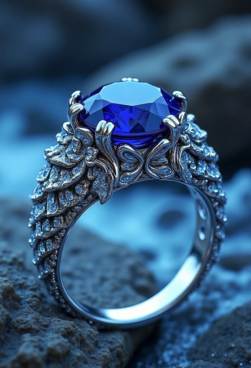 Fantasy-style ring designs, featuring a deep blue sapphire, mermaid - like scales on the ring, under the ocean waves backdrop.