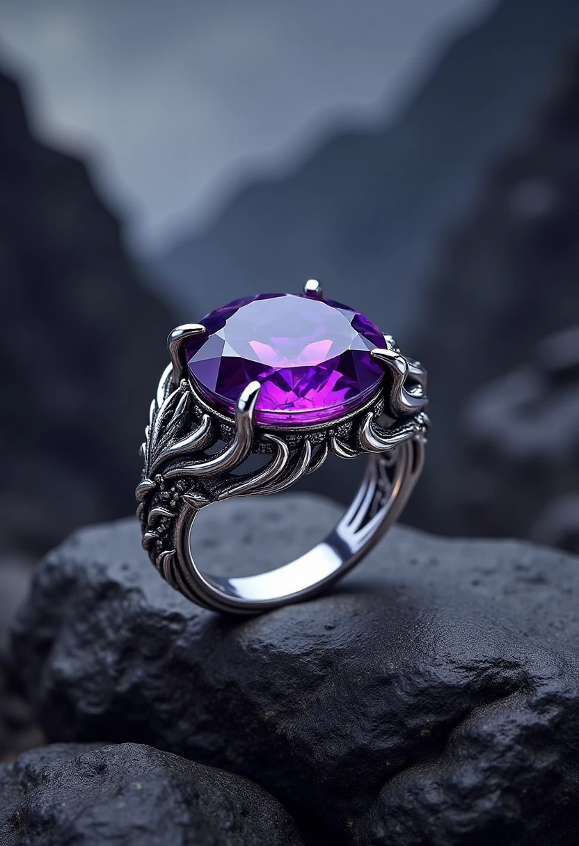 Fantasy-style ring designs, a purple amethyst as the main stone, dragon - claw - shaped metal parts, against a dark, misty mountain.