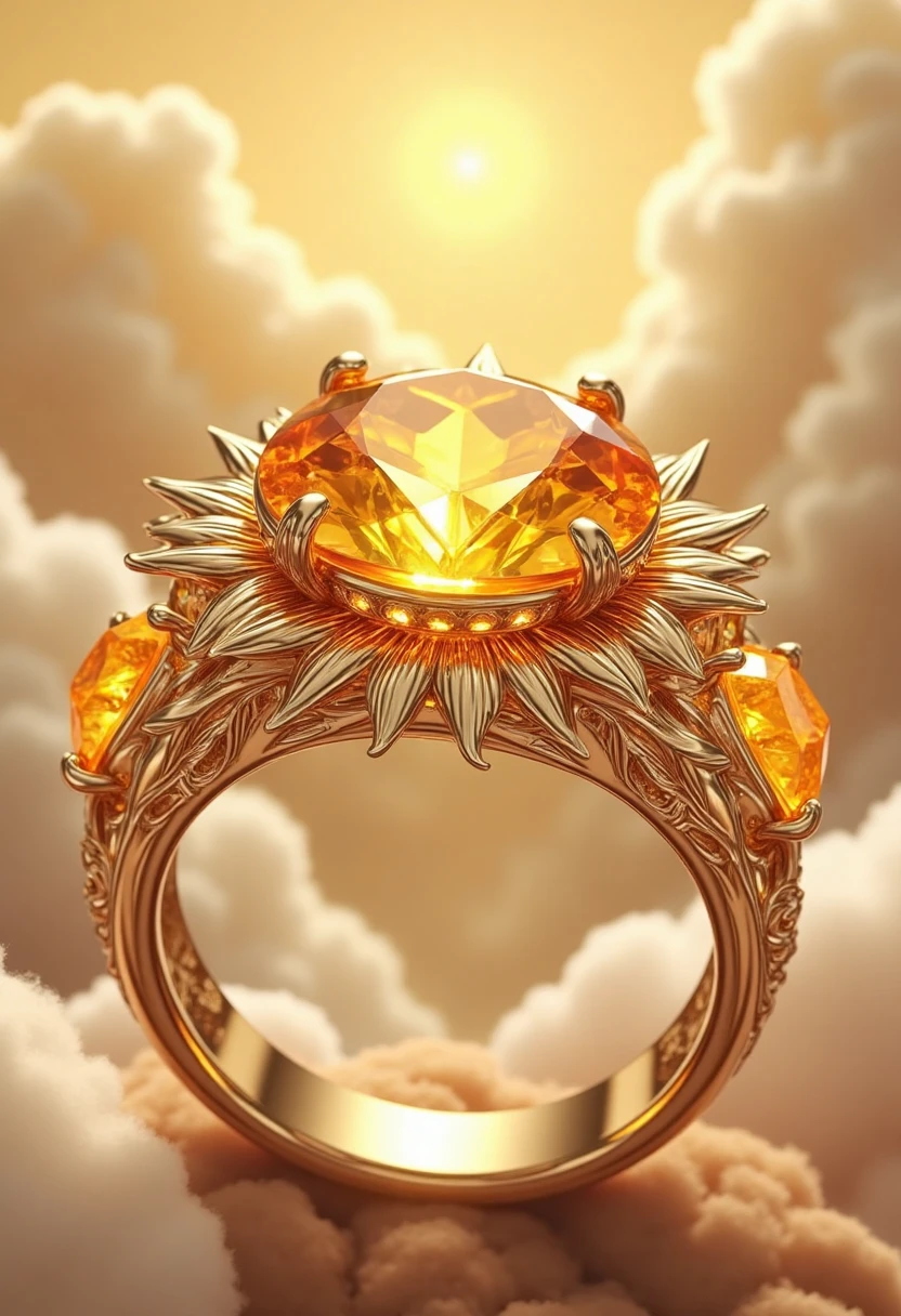 Fantasy-style ring designs, a yellow topaz in the middle, sun - ray - like patterns on the band, under a bright, cloudless sky.