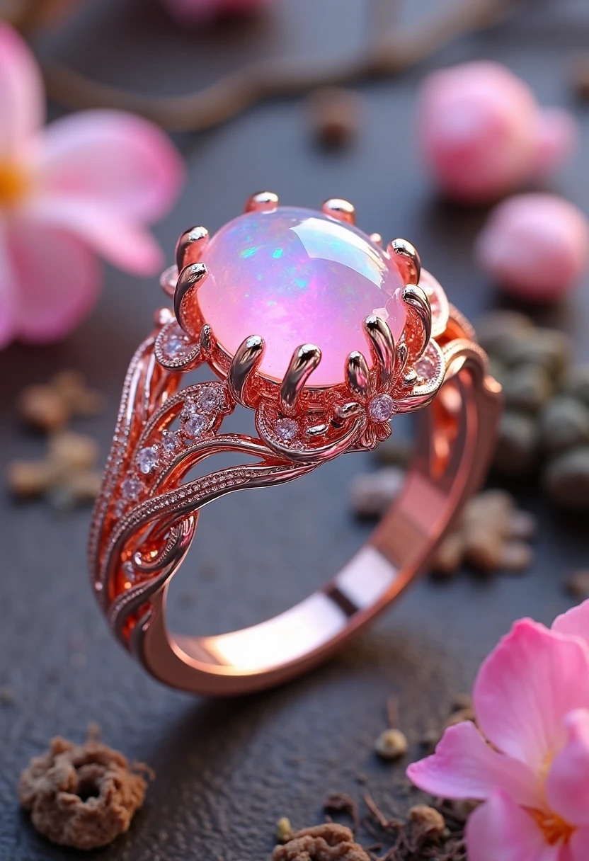 Fantasy-style ring designs, a pink opal at center, ring band like twisted fairy ribbons, in a blooming flower garden.