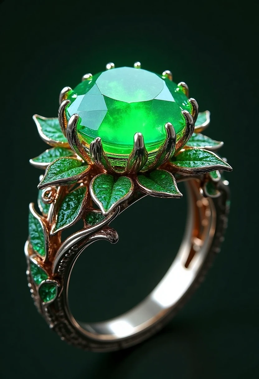 Fantasy-style ring designs, a bright emerald in the middle, with tiny crystal - like leaves on the band, in an enchanted forest setting.