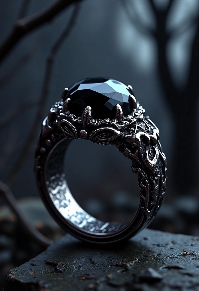 Fantasy-style ring designs, a black obsidian as the core, bat - wing - like engravings on the band, in a moonless night cemetery.