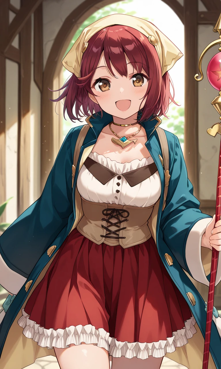 Default outfit : sophieatelier,red hair, brown eyes,ahoge,short hair, long sleeves, jewelry, wide sleeves, necklace, bare legs, red skirt, frilled skirt, corset, open coat, underbust, cross-laced clothes, head scarf, long coat, blue coat,collared coat,