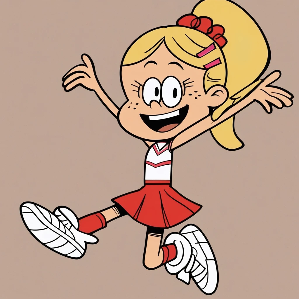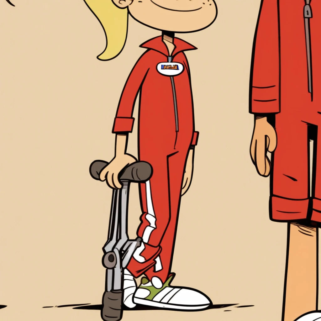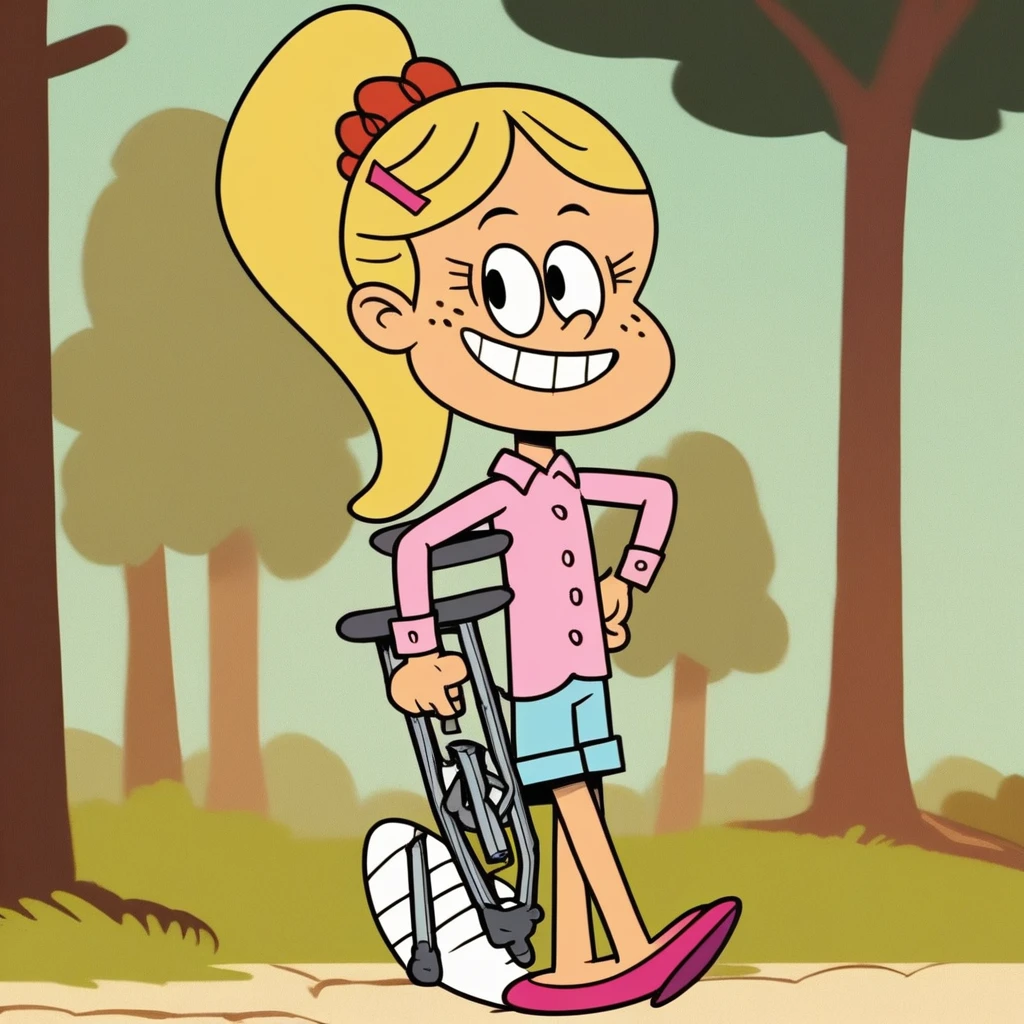 lh_paula, 1girl, solo, fair skin, blonde hair, ponytail, red scrunchie, freckles, crutch, foot cast,