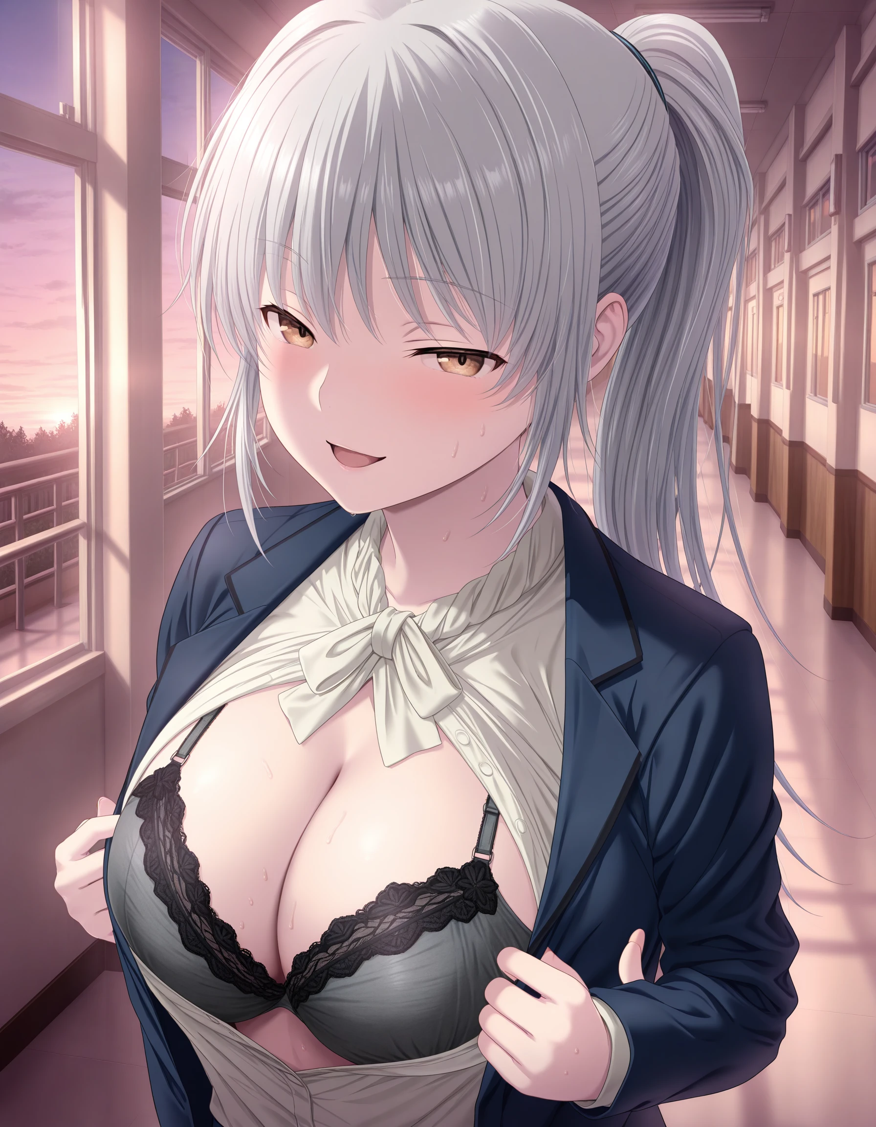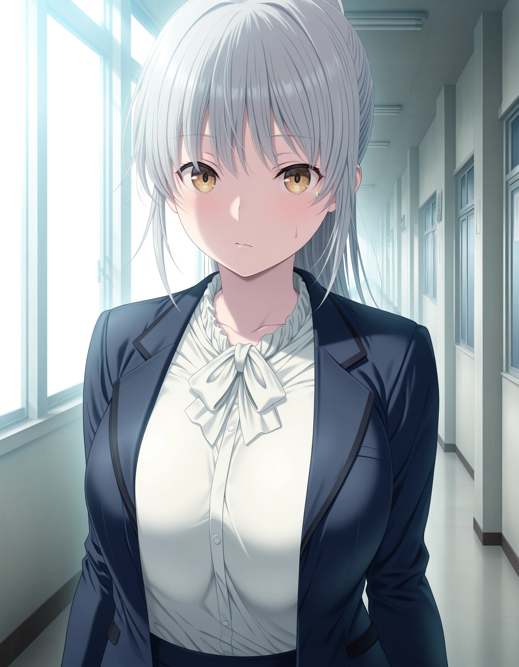 hakua_kct1, 1girl, long hair, grey hair, ponytail, yellow eyes, large breasts