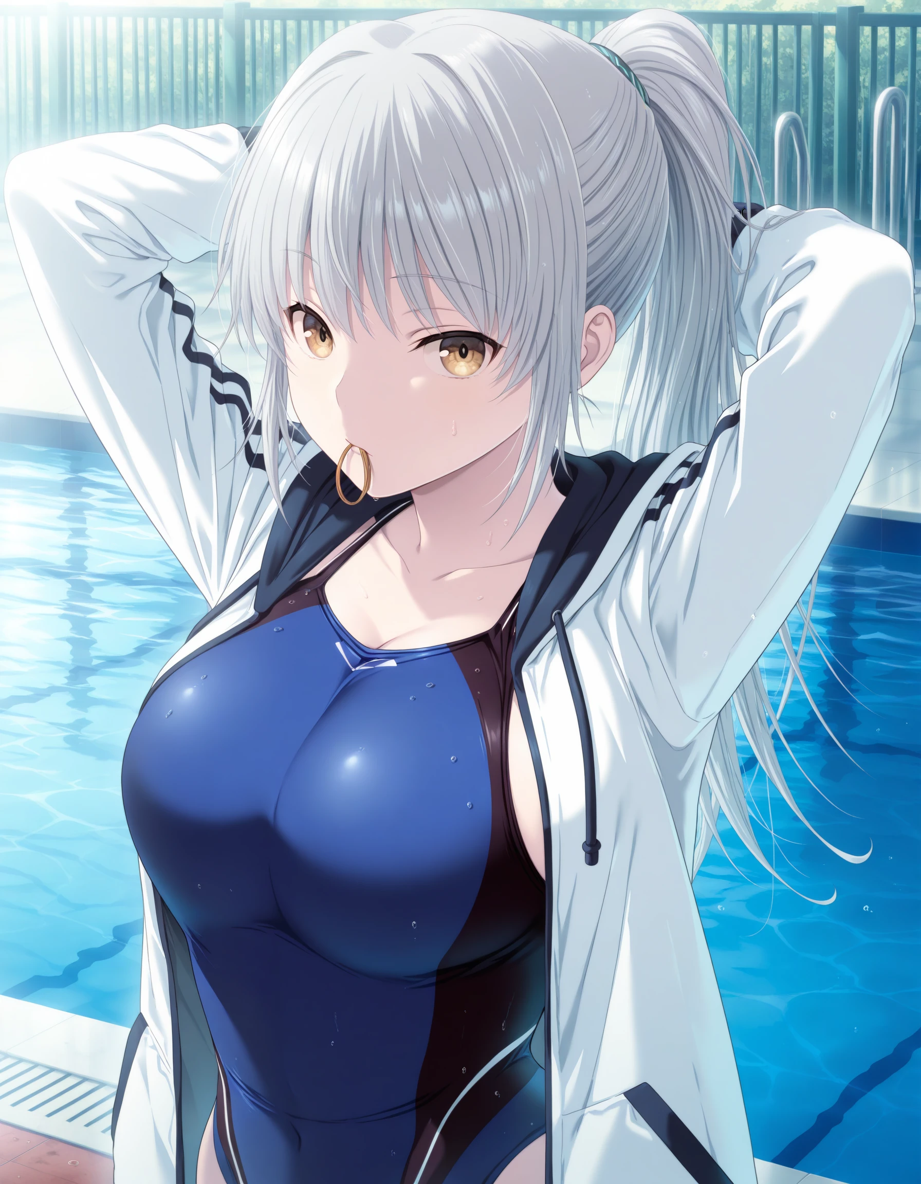 competition swimsuit, blue one-piece swimsuit, multicolored swimsuit, jacket, hooded jacket, white jacket