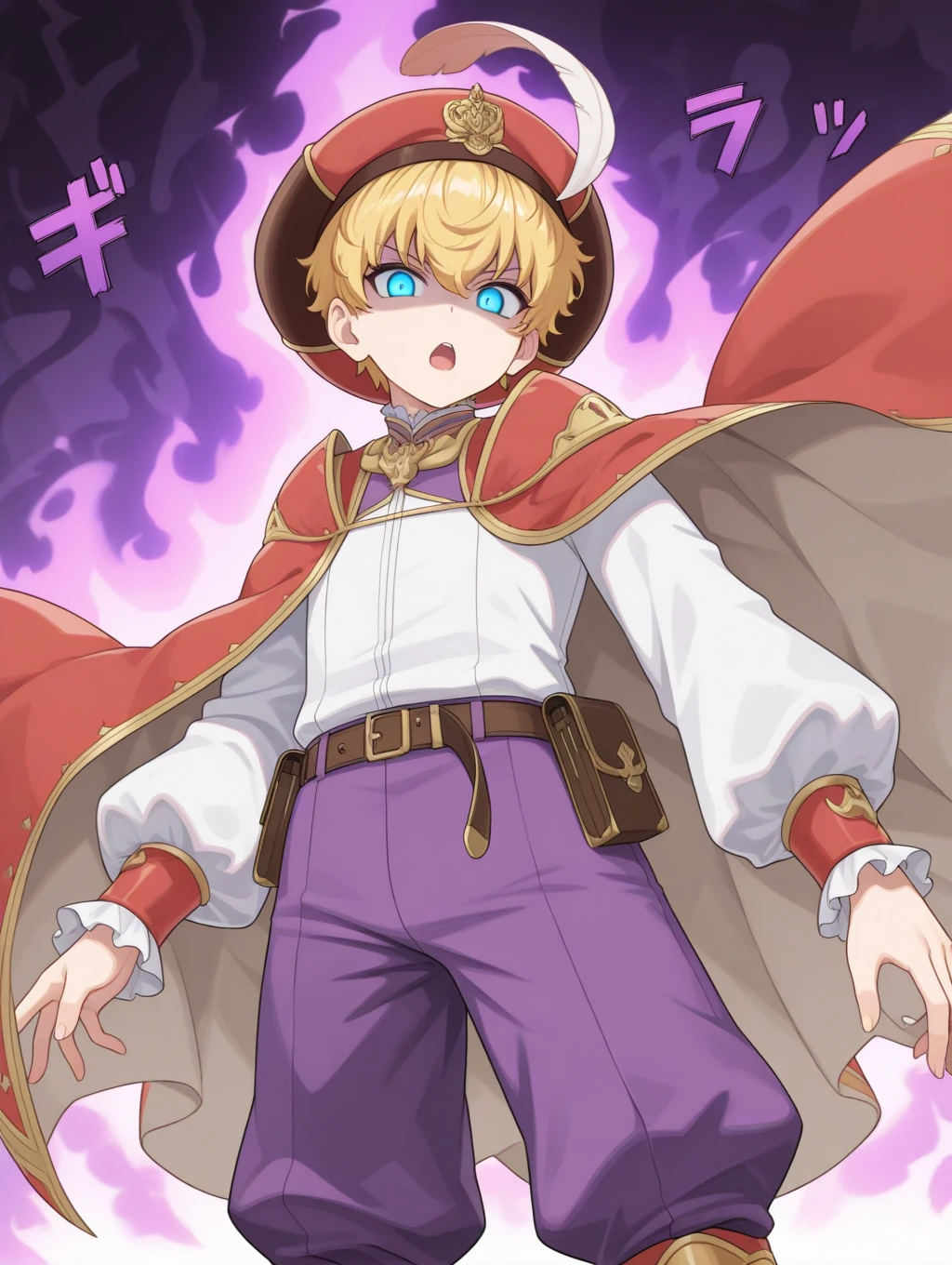 alef, 1boy, blonde hair, short hair, blue eyes, male focus, hat, red cape, cape, purple pants, red headwear, open mouth, short hair, long sleeves, white shirt, pants, shirt, pouch, belt, puffy sleeves,