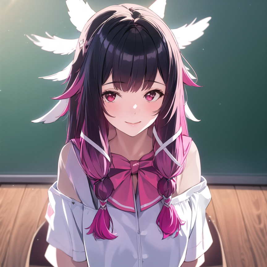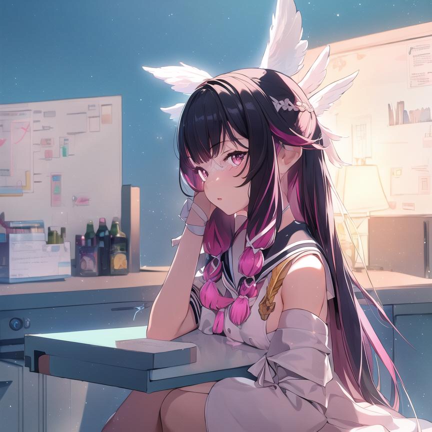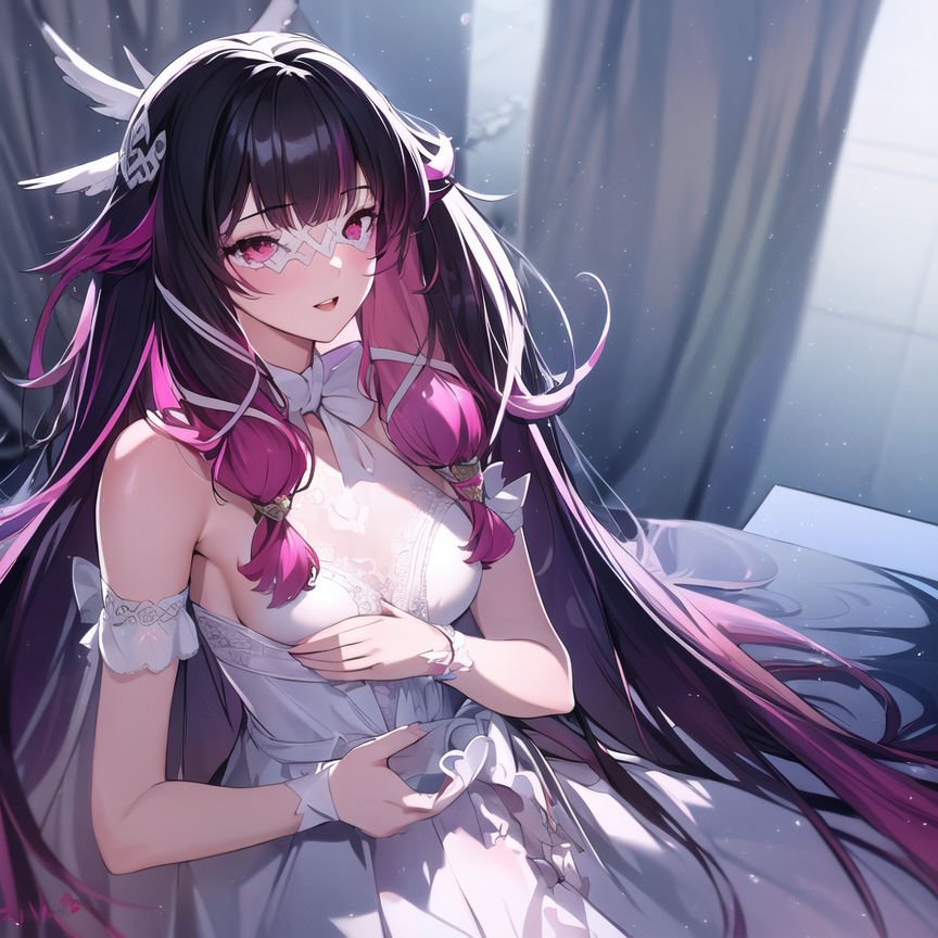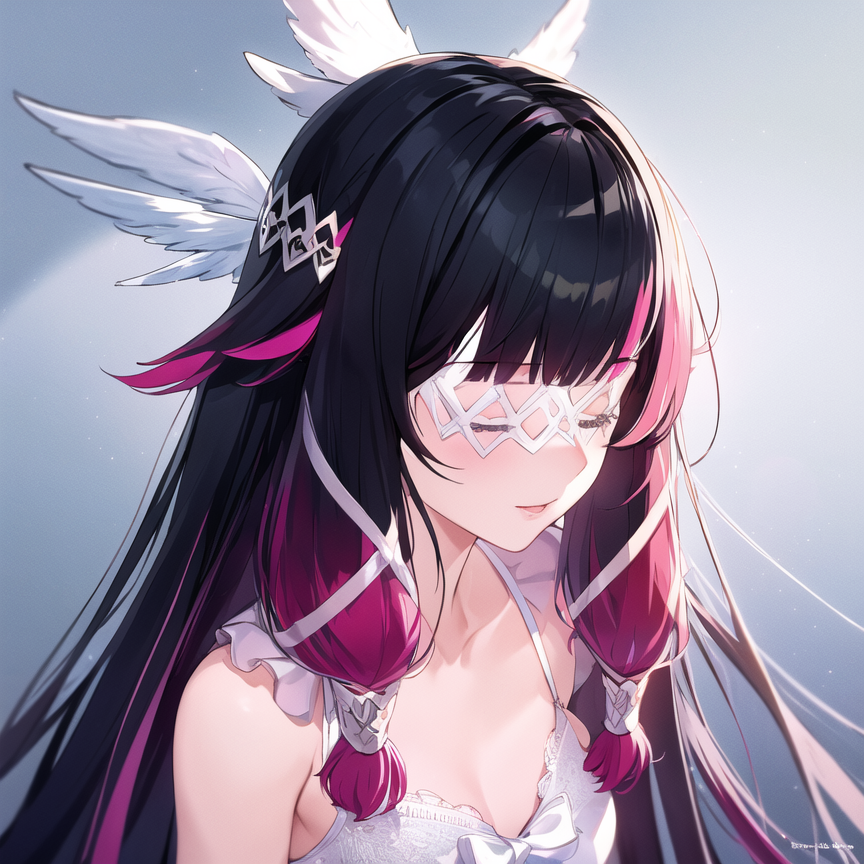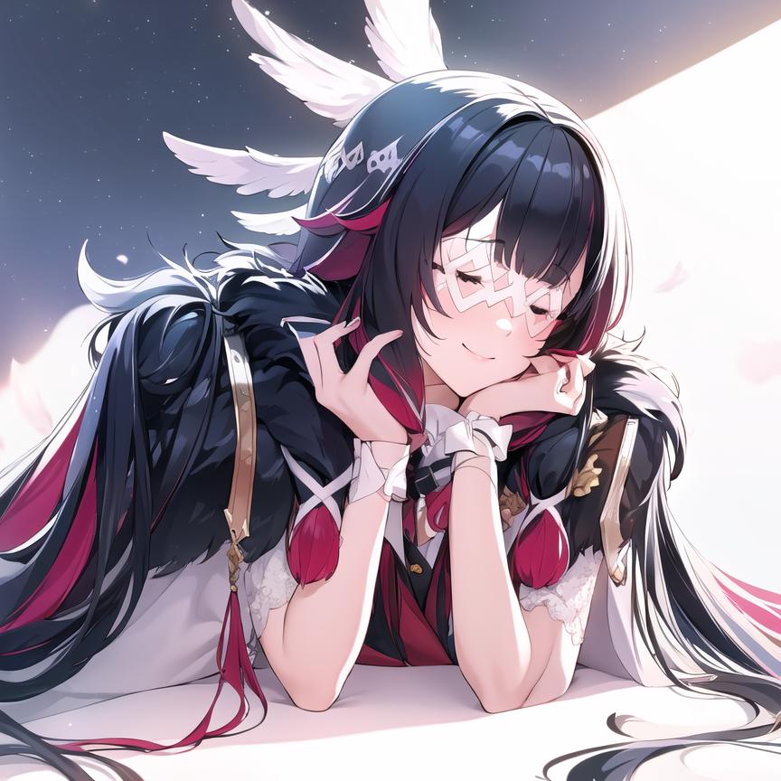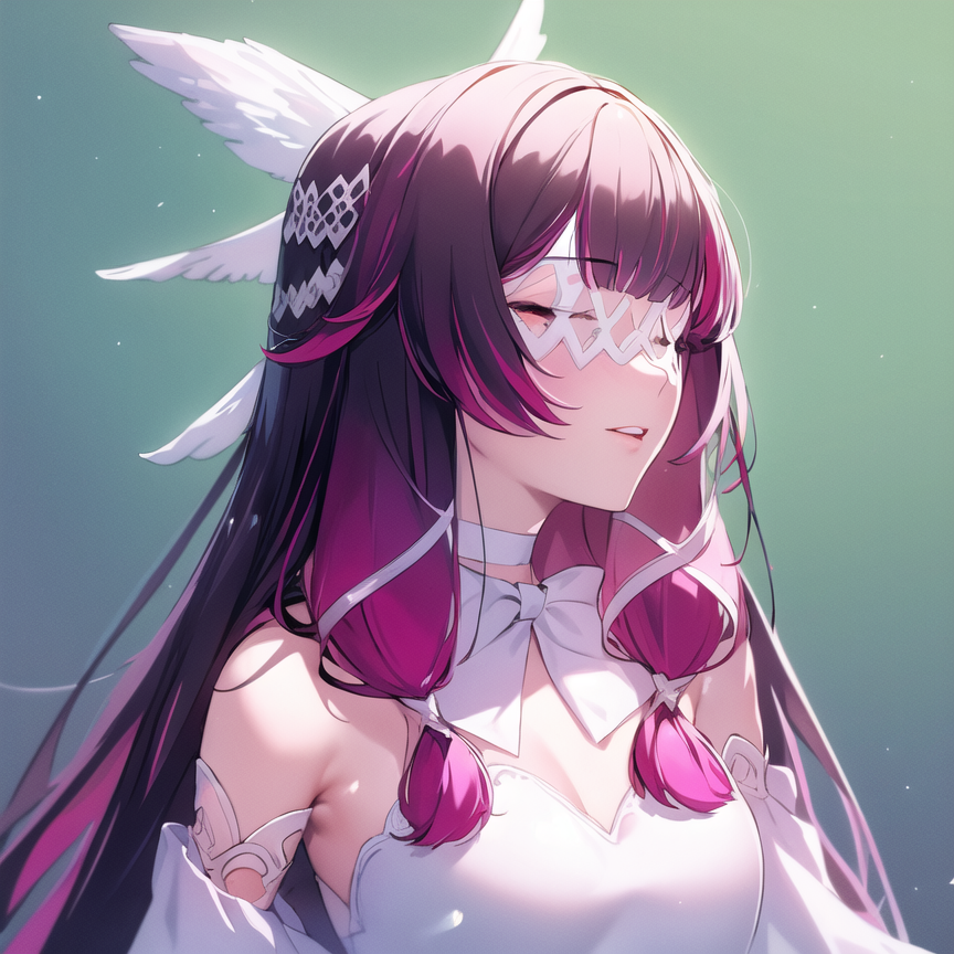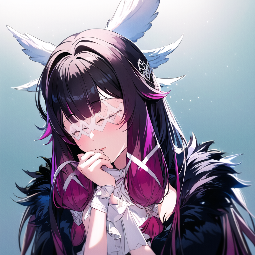 Use this : Columbina, hair ornament, closed eyes, pink hair, coat, fur trim, head wings, fur-trimmed coat, eye mask, white mask