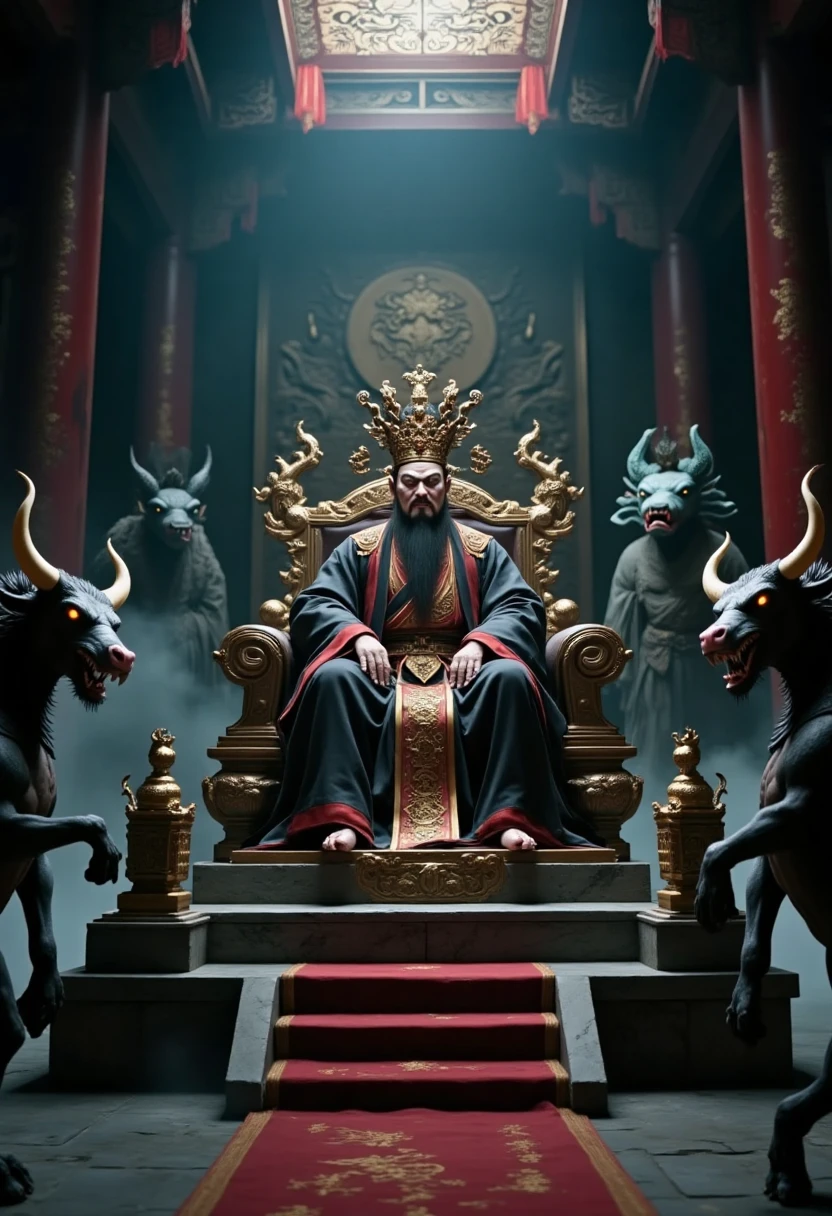 1. Chinese netherworld deity theme Chinese netherworld deity theme, Yanluo sitting in the hall, writing with a brush, accompanied by bull - headed and horse - faced spirits, surrounded by dark clouds and ghostly auras.