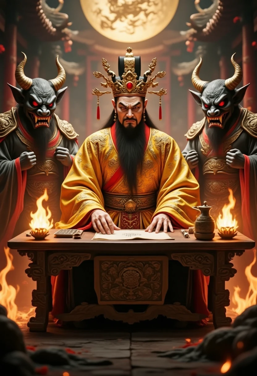 8. Chinese netherworld deity theme Chinese netherworld deity theme, a god in golden robe sitting at a desk, flanked by demon guards, flames burning, showing a majestic netherworld scene.