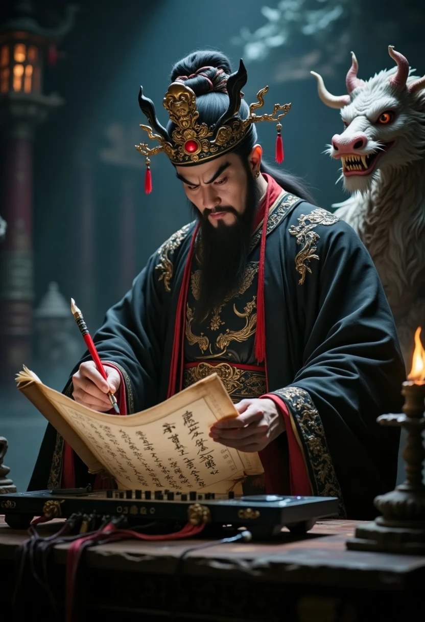 3. Chinese netherworld deity theme Chinese netherworld deity theme, a god in black robe holding a red pen, checking the book of life and death, with a divine beast by his side in a dimly lit space.
