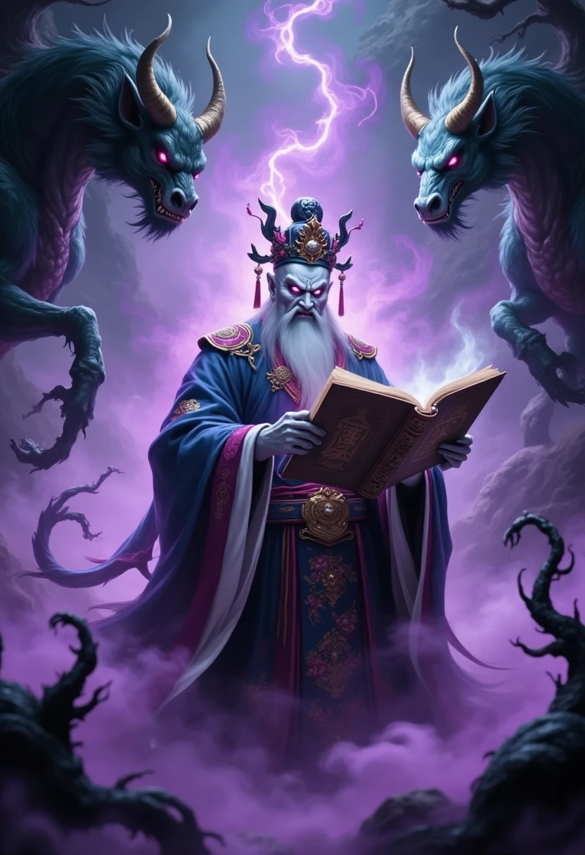 9. Chinese netherworld deity theme Chinese netherworld deity theme, a spectral - like god holding a book of life, surrounded by purple mist, with eerie creatures, creating a fantastical netherworld atmosphere.