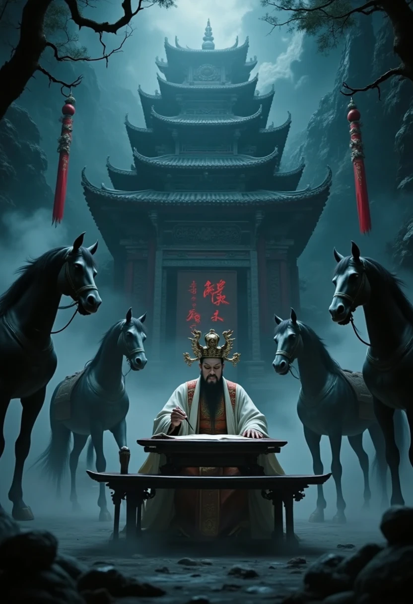6. Chinese netherworld deity theme Chinese netherworld deity theme, a gloomy scene with a god writing, a ghost kneeling, and black horses, filled with a sense of terror and solemnity.