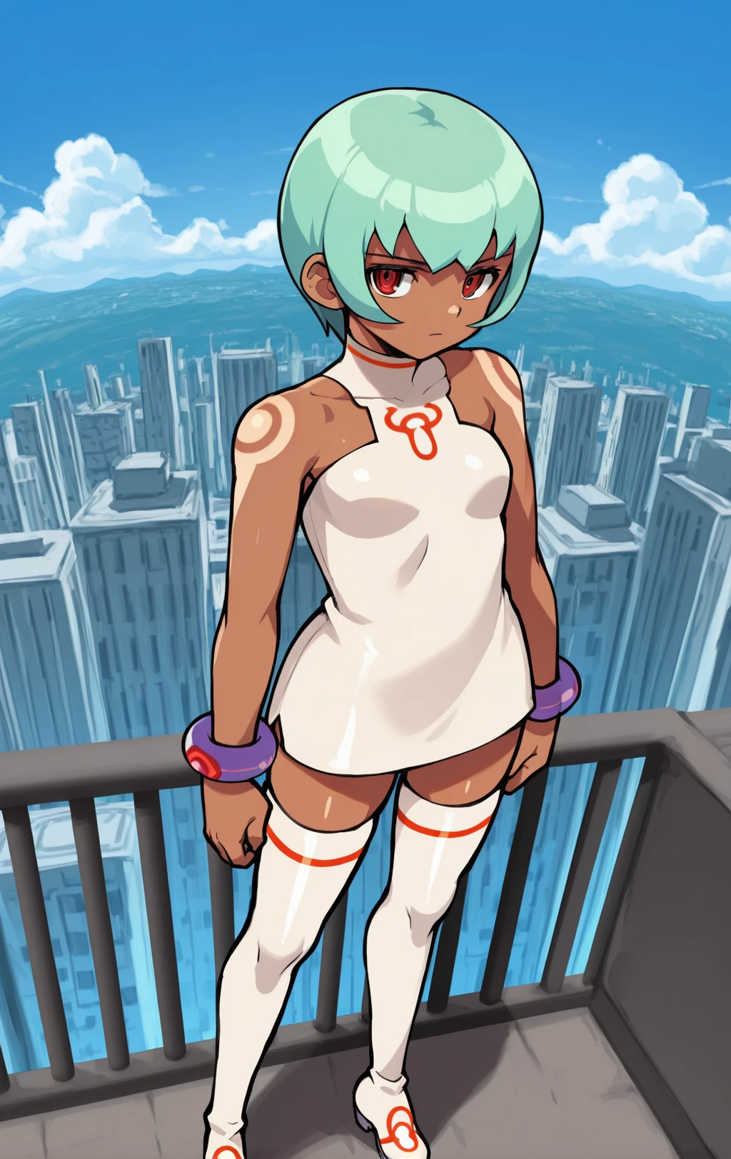 Use white dress, mml2 dress, turtleneck, white boots, long boots, purple wrist brace for the complete outfit.