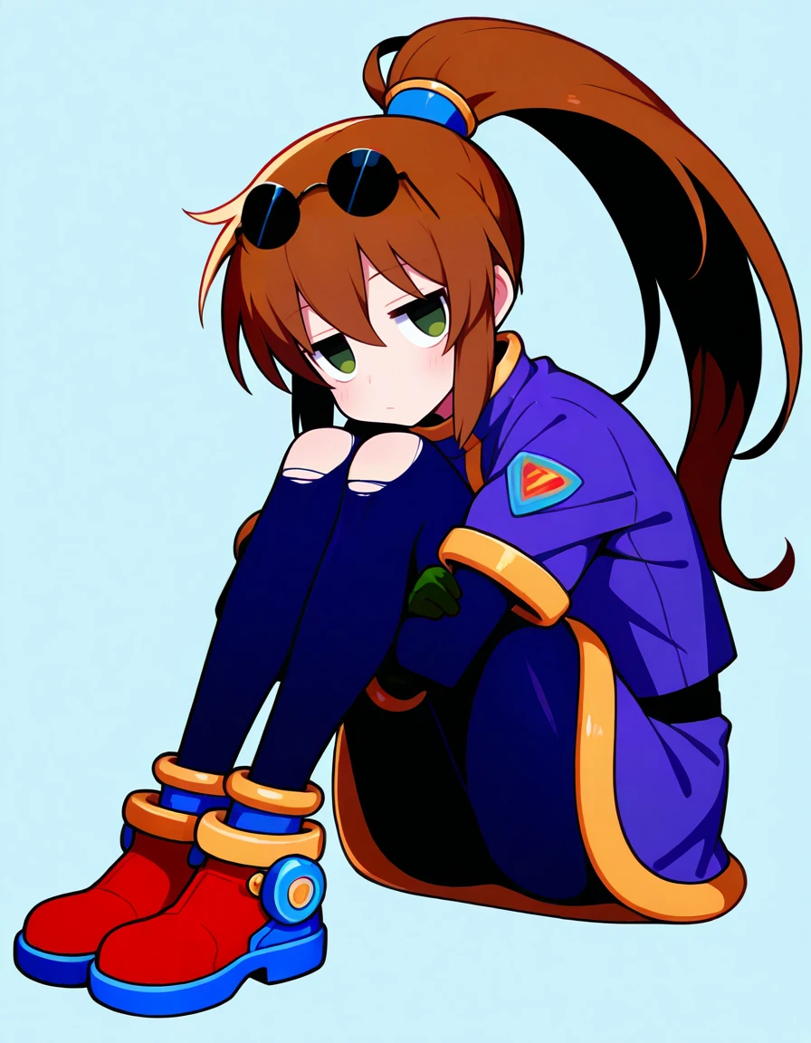 Recommended Prompts: 1girl,brown hair, ponytail,blue dress,skirt,pantyhose,green eyes, gloves,eyewear on head,torn pantyhose,footwear,