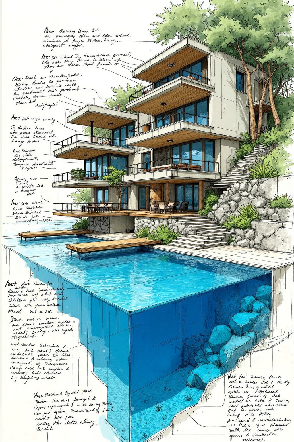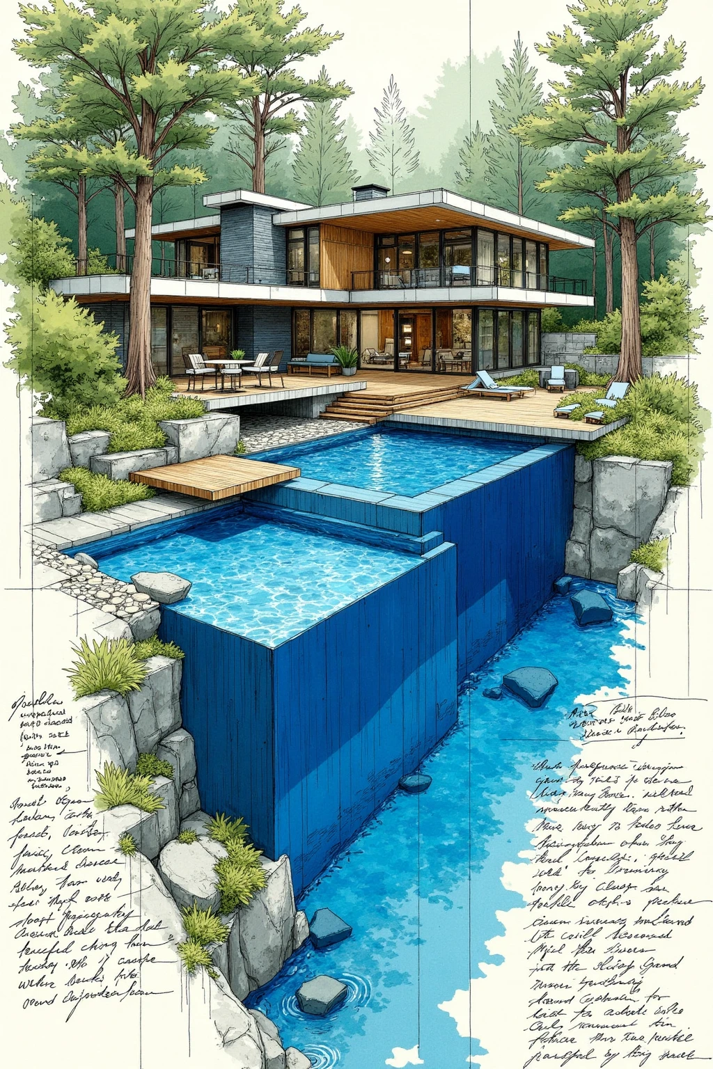 Integrating architectural sketches with blue water elements, draw a waterfall - side house. Deep blue waterfall pool, house cantilevered over water, dense forest, and hand - drawn text.