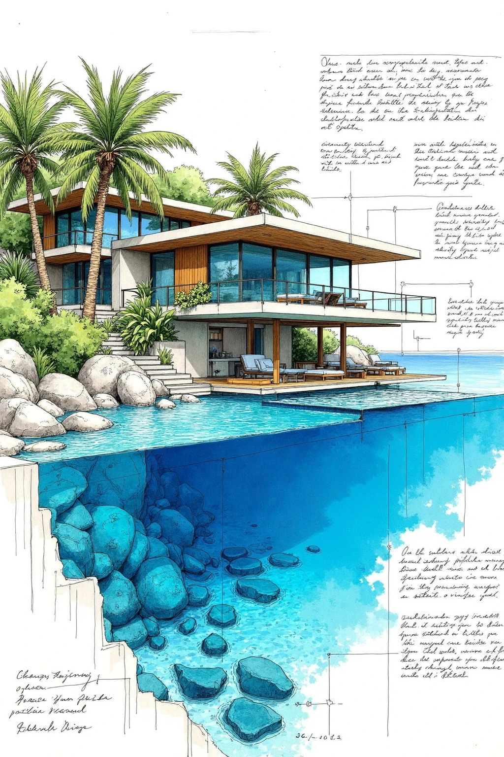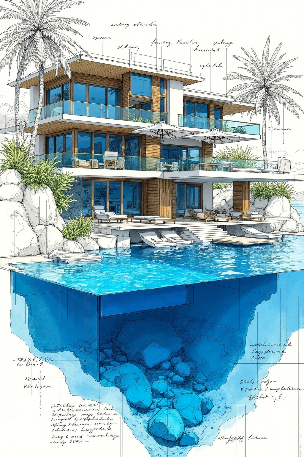 Integrating architectural sketches with blue water elements, fashion a lagoon - front villa. Azure lagoon, villa with open terraces, coral - like rocks, and technical drawing lines.