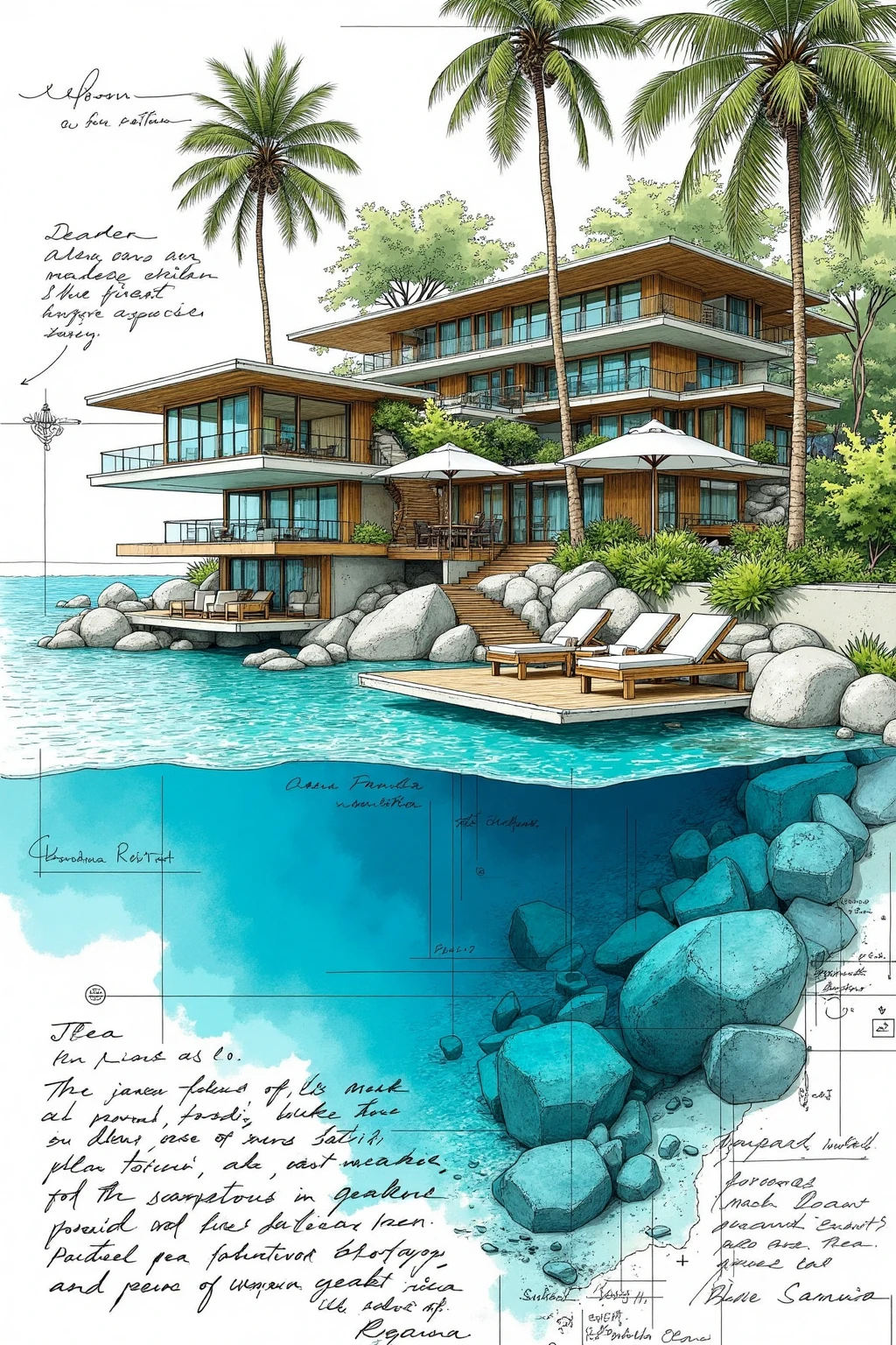 Integrating architectural sketches with blue water elements, make a seaside resort. Turquoise sea, multi - level resort building, palm trees, and blueprint - like textures.