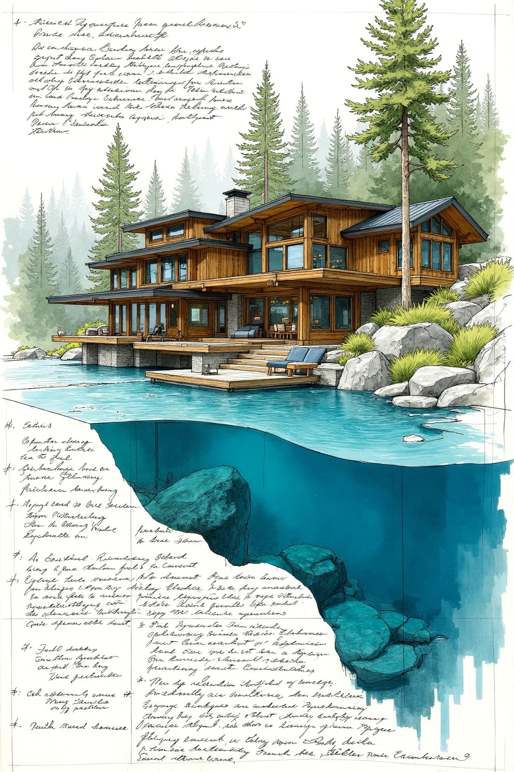 Integrating architectural sketches with blue water elements, design a mountain - lake lodge. Teal lake, lodge with wooden beams, pine trees, and hand - written blueprints.
