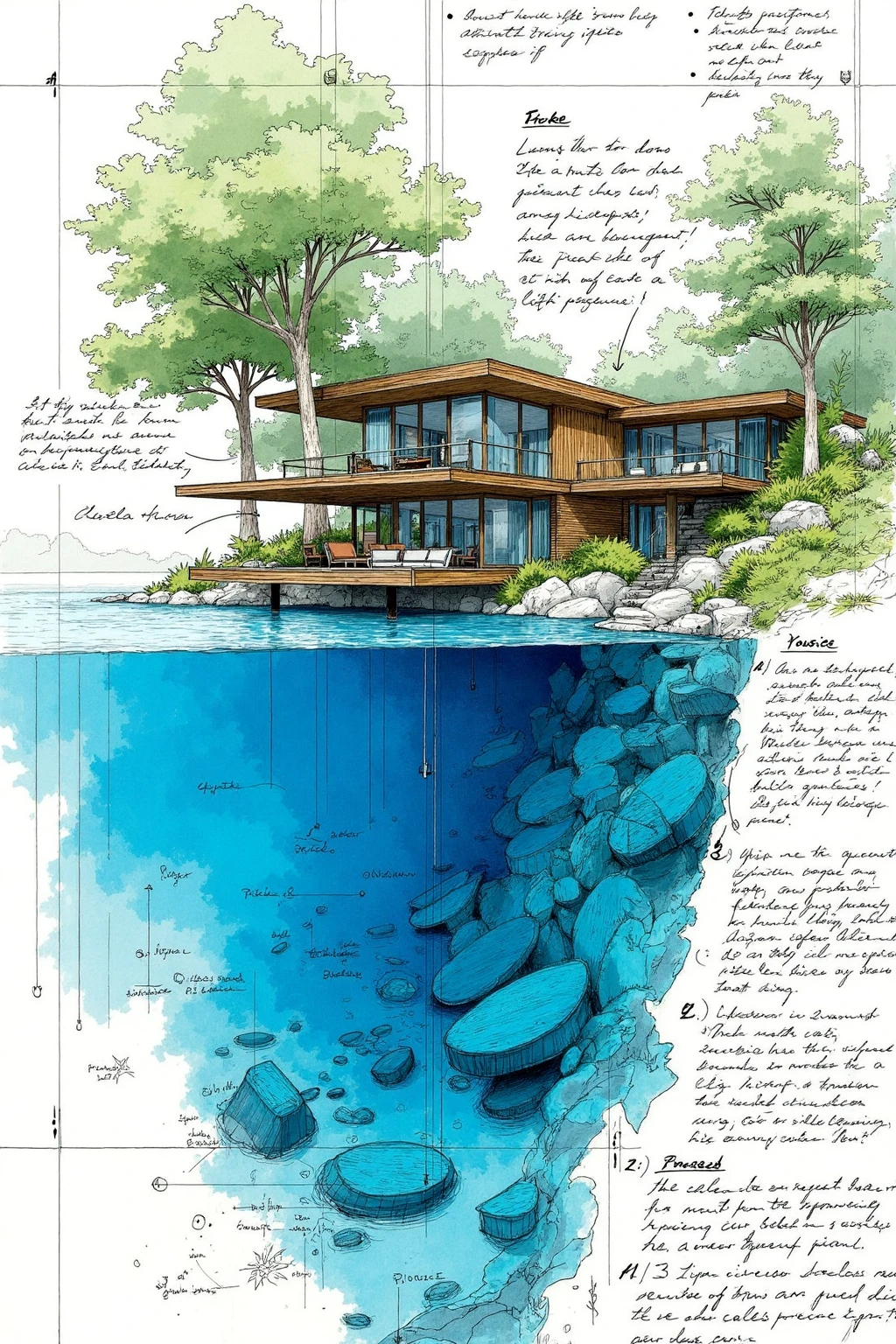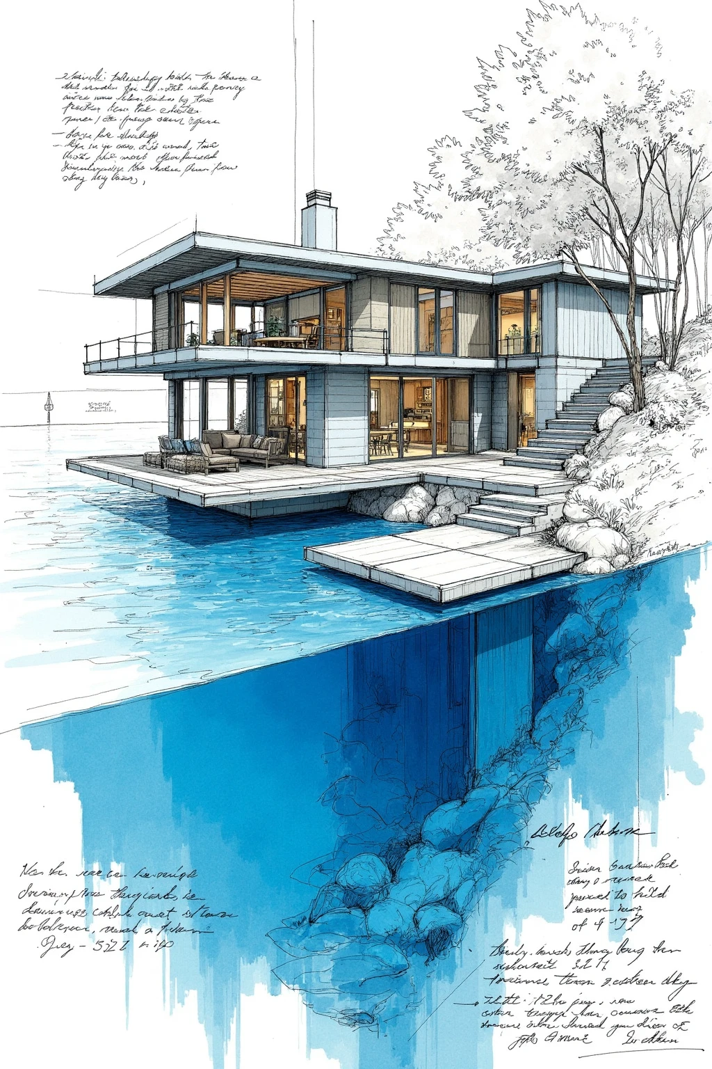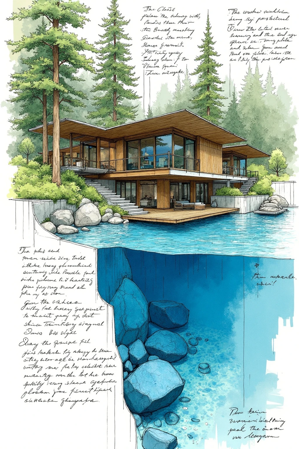 Integrating architectural sketches with blue water elements, create a lakeside villa. Use light blue water, detailed wood - structured house, surrounded by lush trees, and hand - written notes in the background.