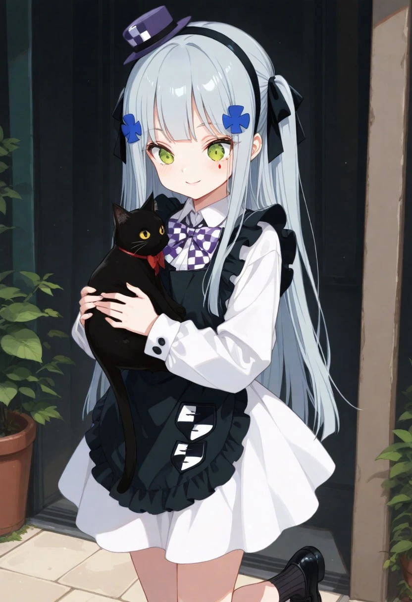 HK416L, 1girl, long hair, hair ornament, ribbon, very long hair, green eyes, hair ribbon, grey hair, facial mark, aged down,