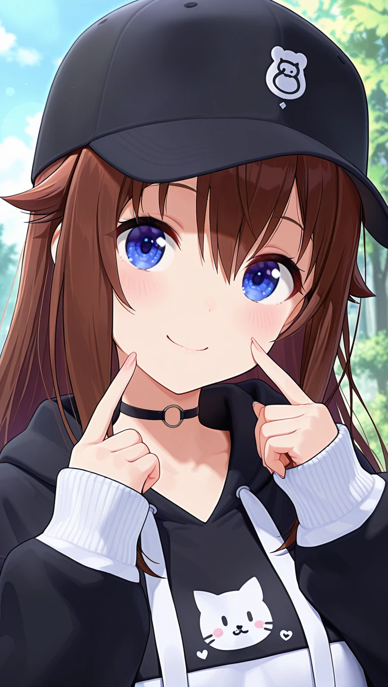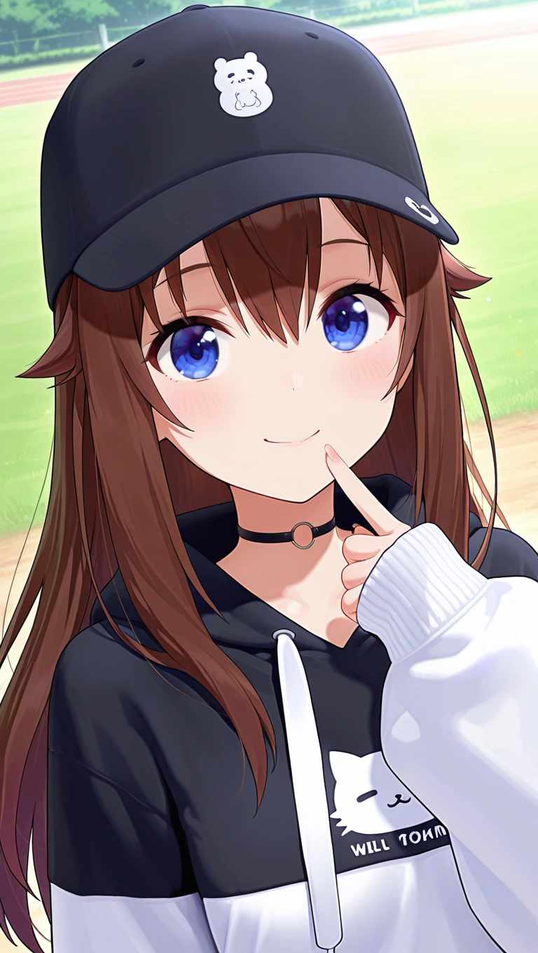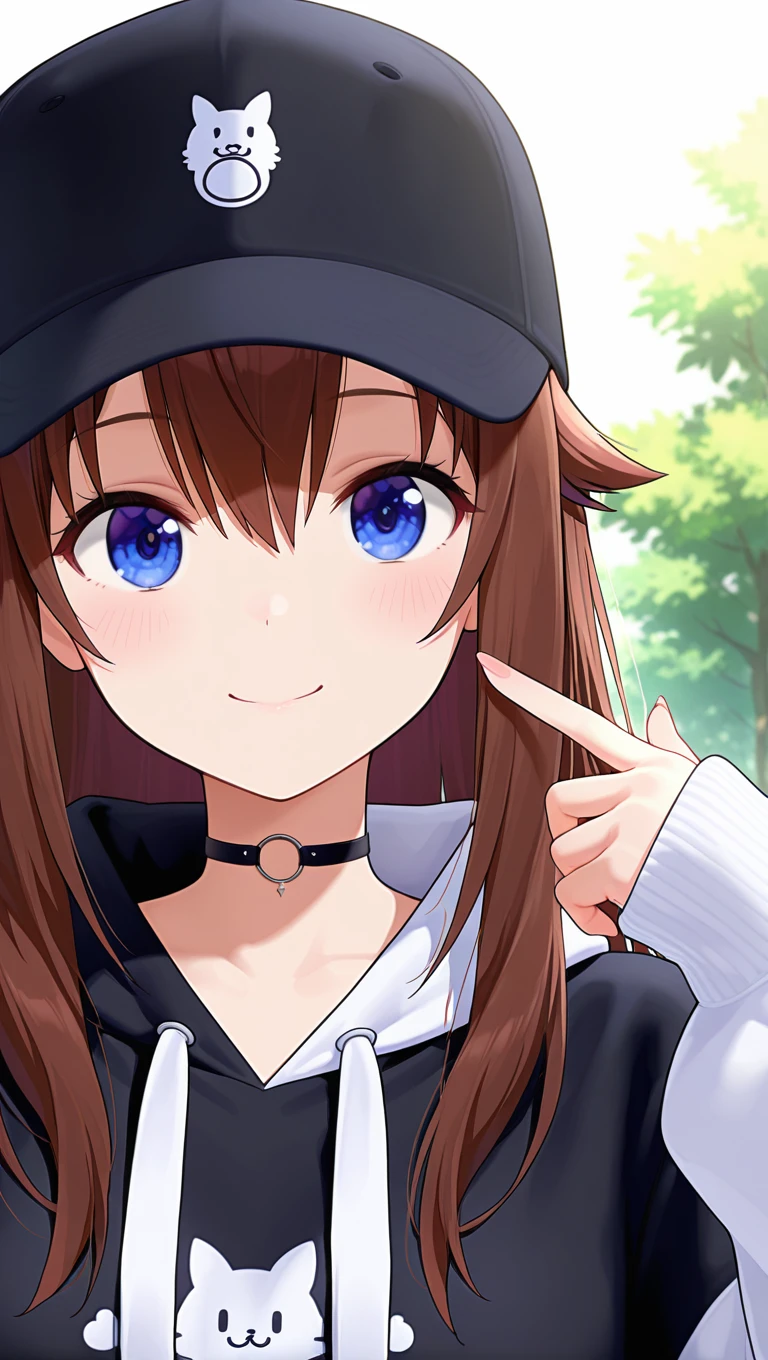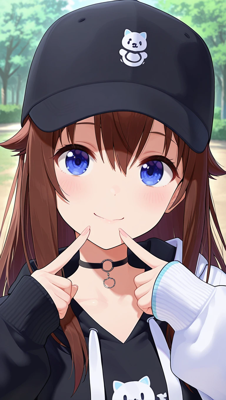 baseball cap,black headwear,long hair,brown hair,hair flaps,hair between eyes,blue eyes