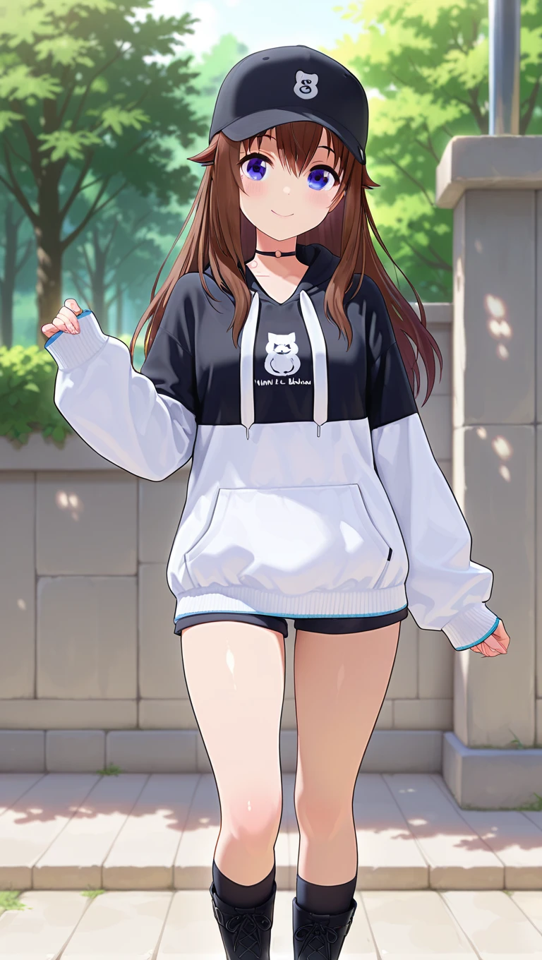 o-ring choker,black choker,black hoodie,two-tone hoodie,white hoodie,hood down,white hoodie,sleeves past wrists,black shorts,short shorts,black socks,platform boots,cross-laced footwear,black footwear