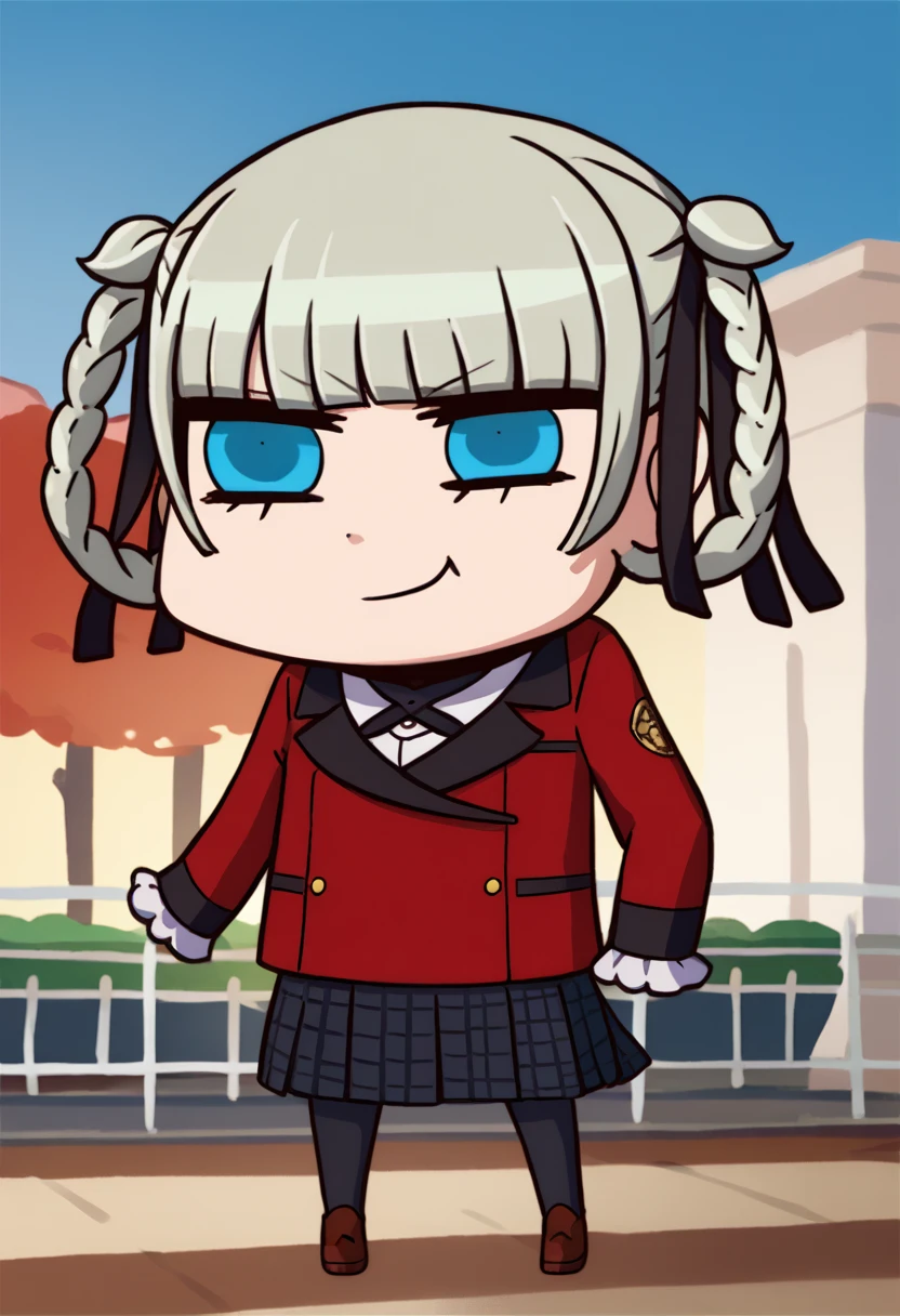 momobami kirari, makeup, blue lips, grey hair, braided hair rings, twin braids, hair ribbon