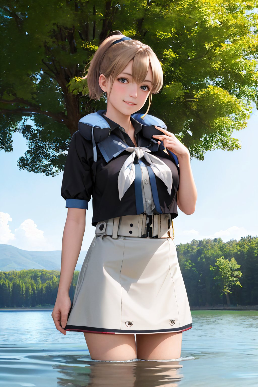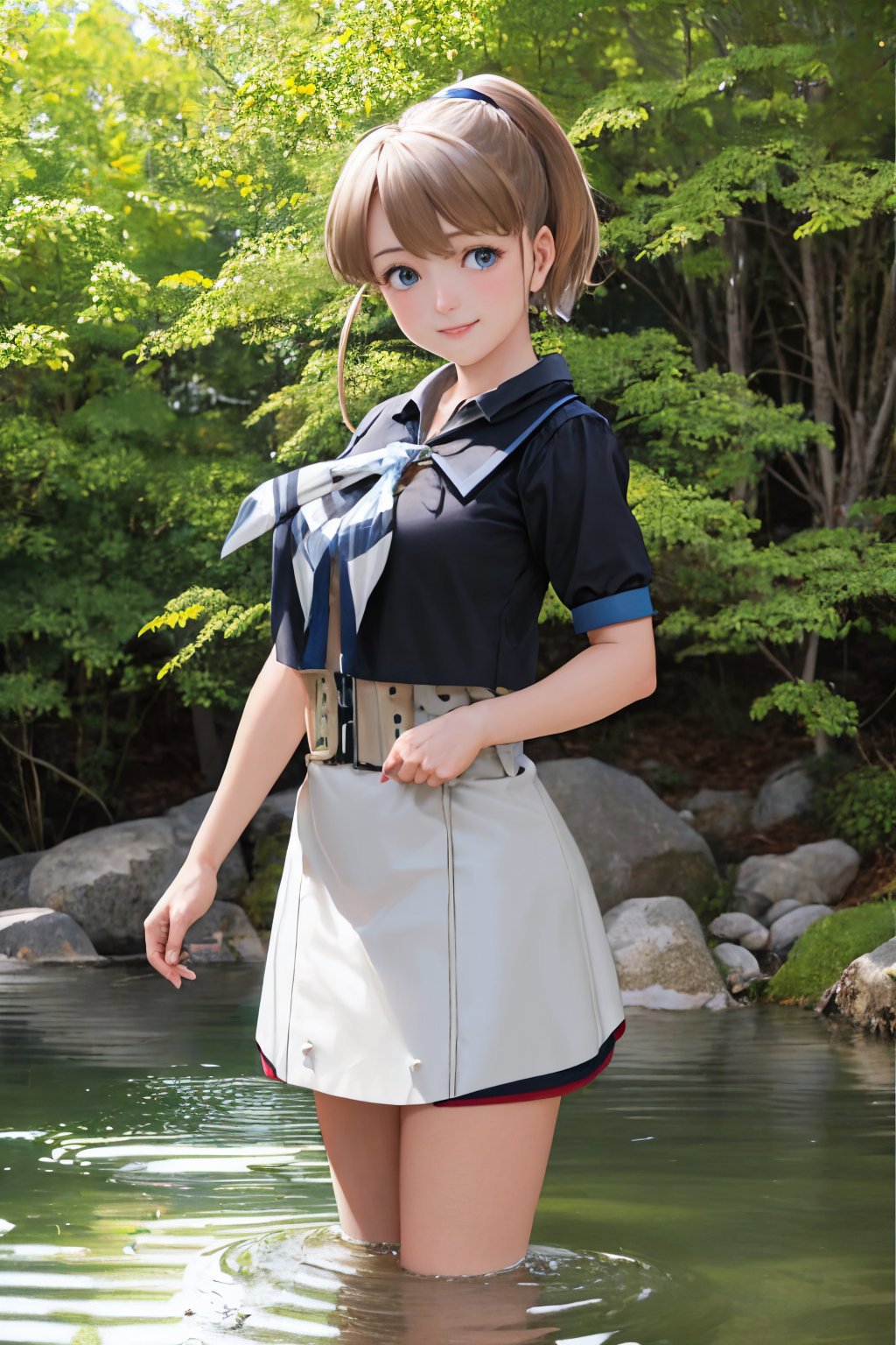 Default Outfit: black shirt, grey neckerchief, white skirt