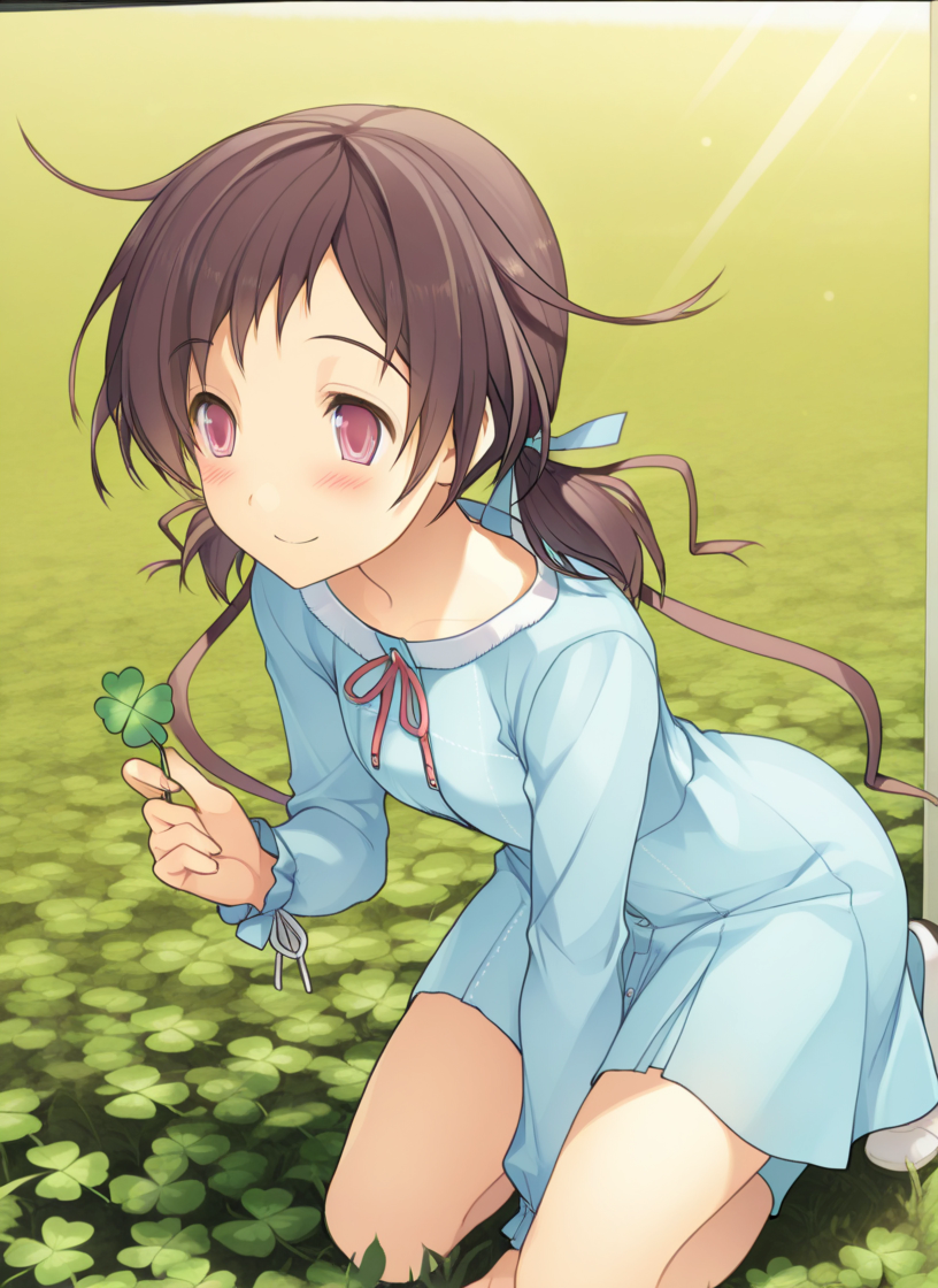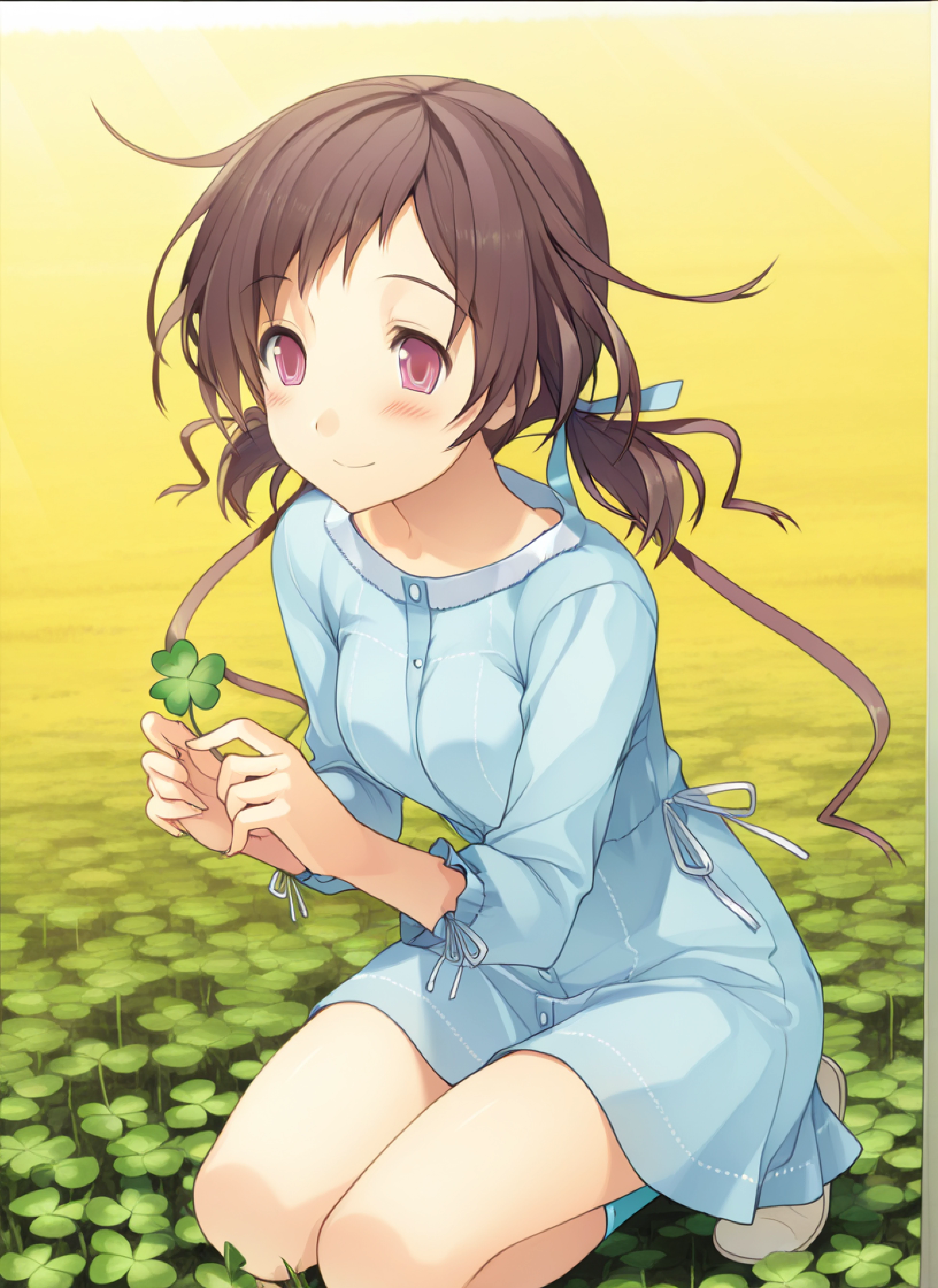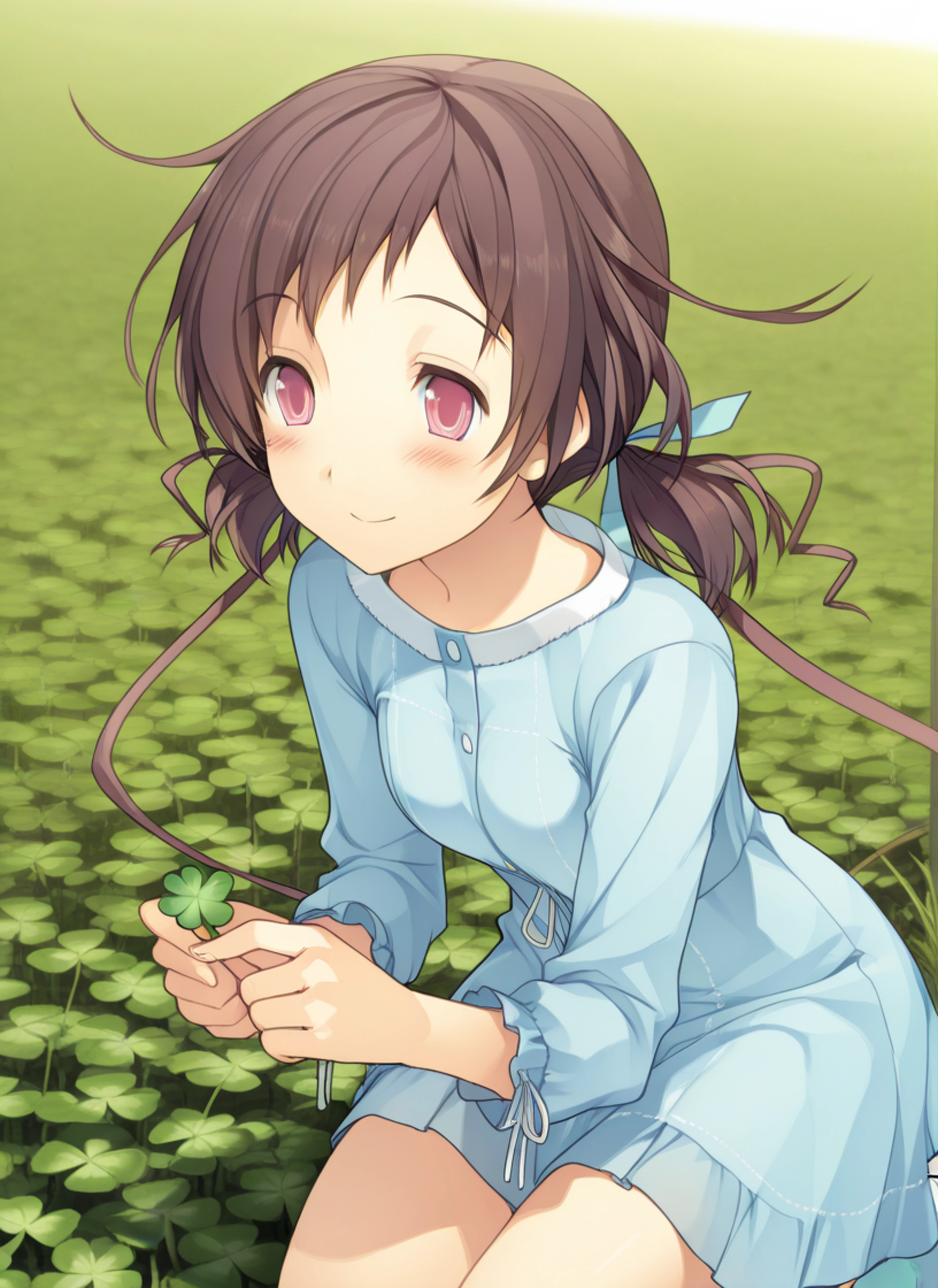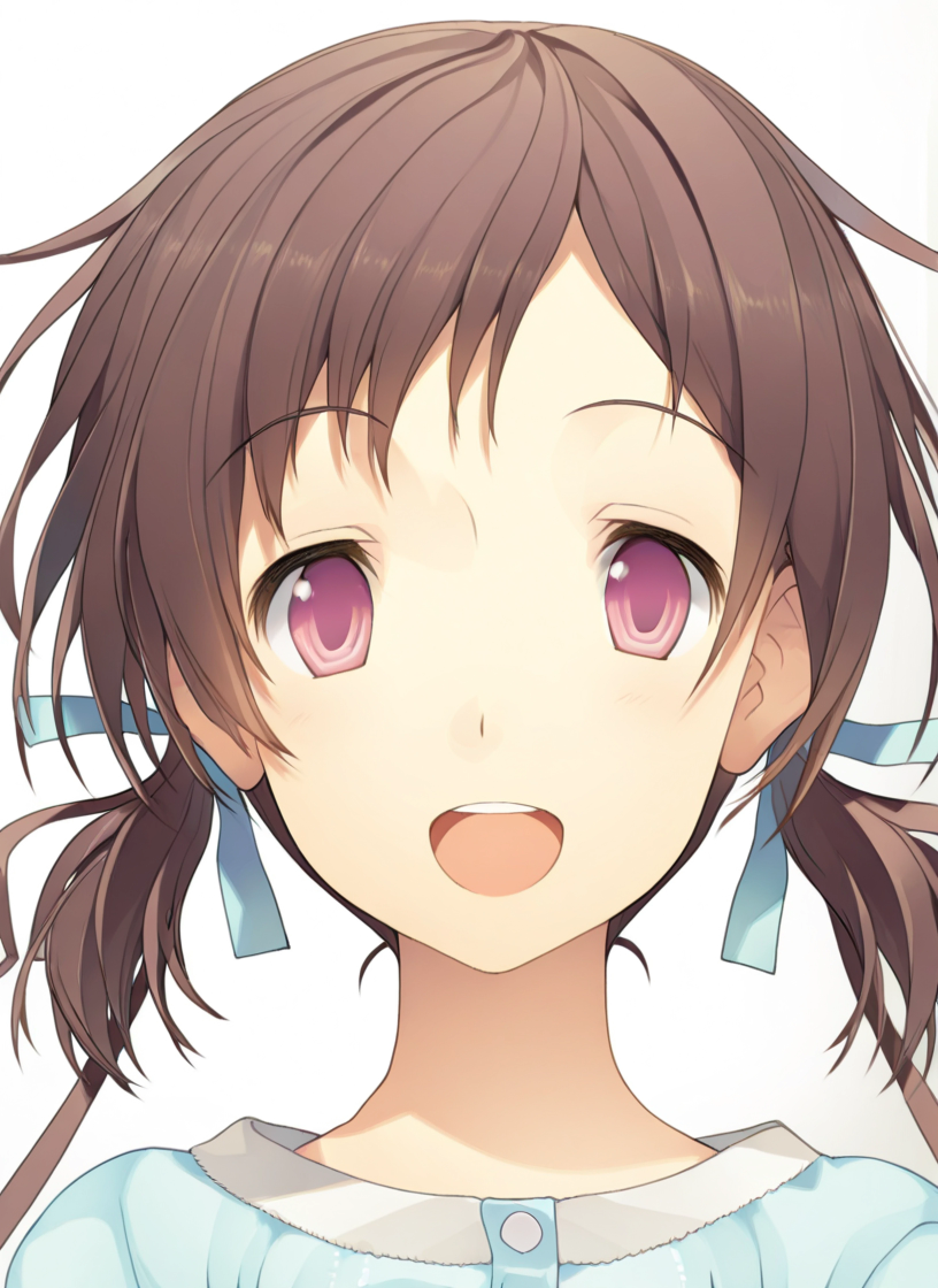 Isara Aomi, brown hair, short hair, pink eyes, bangs, sidelocks, low twintails, hair ribbons, official style