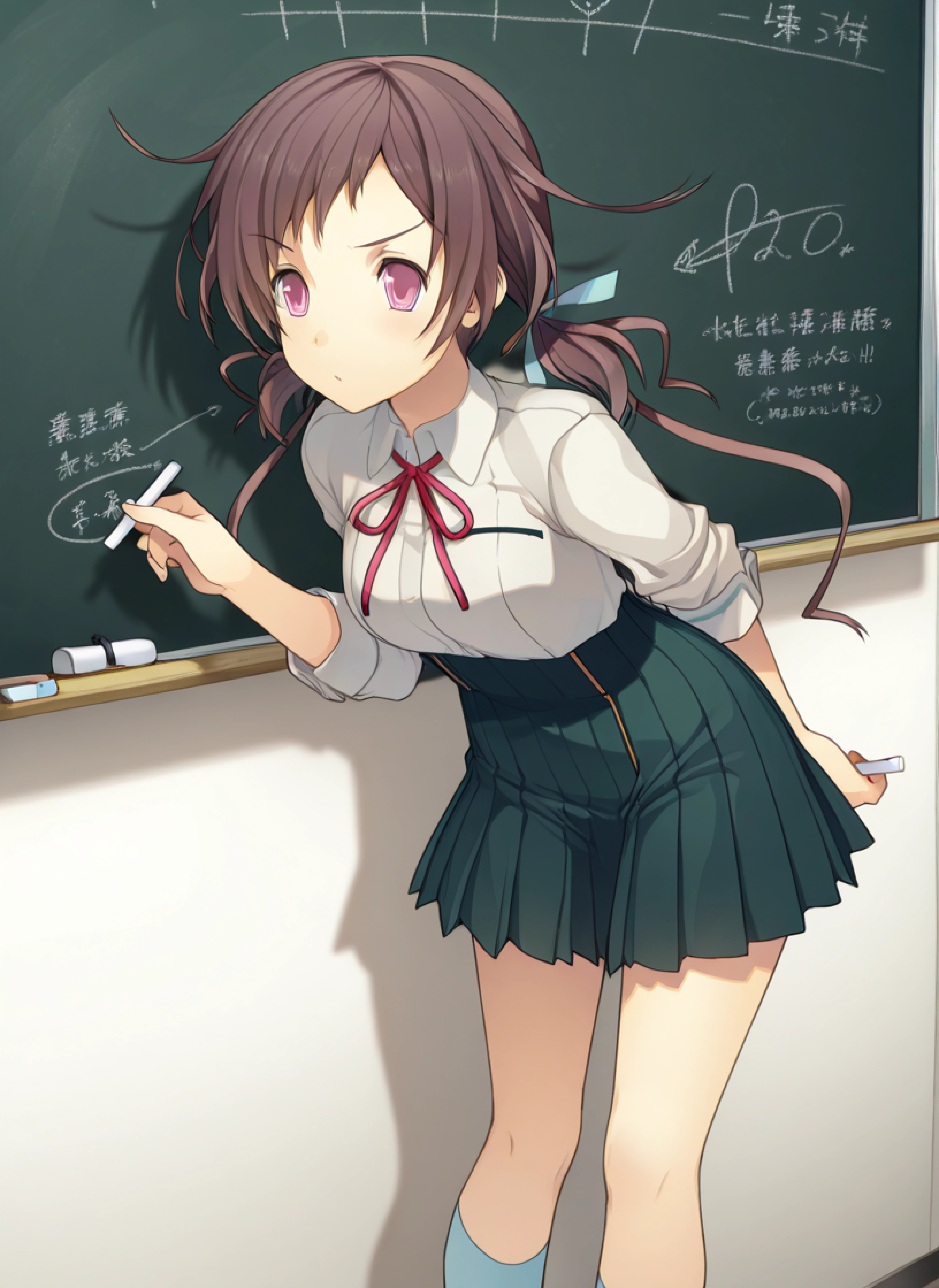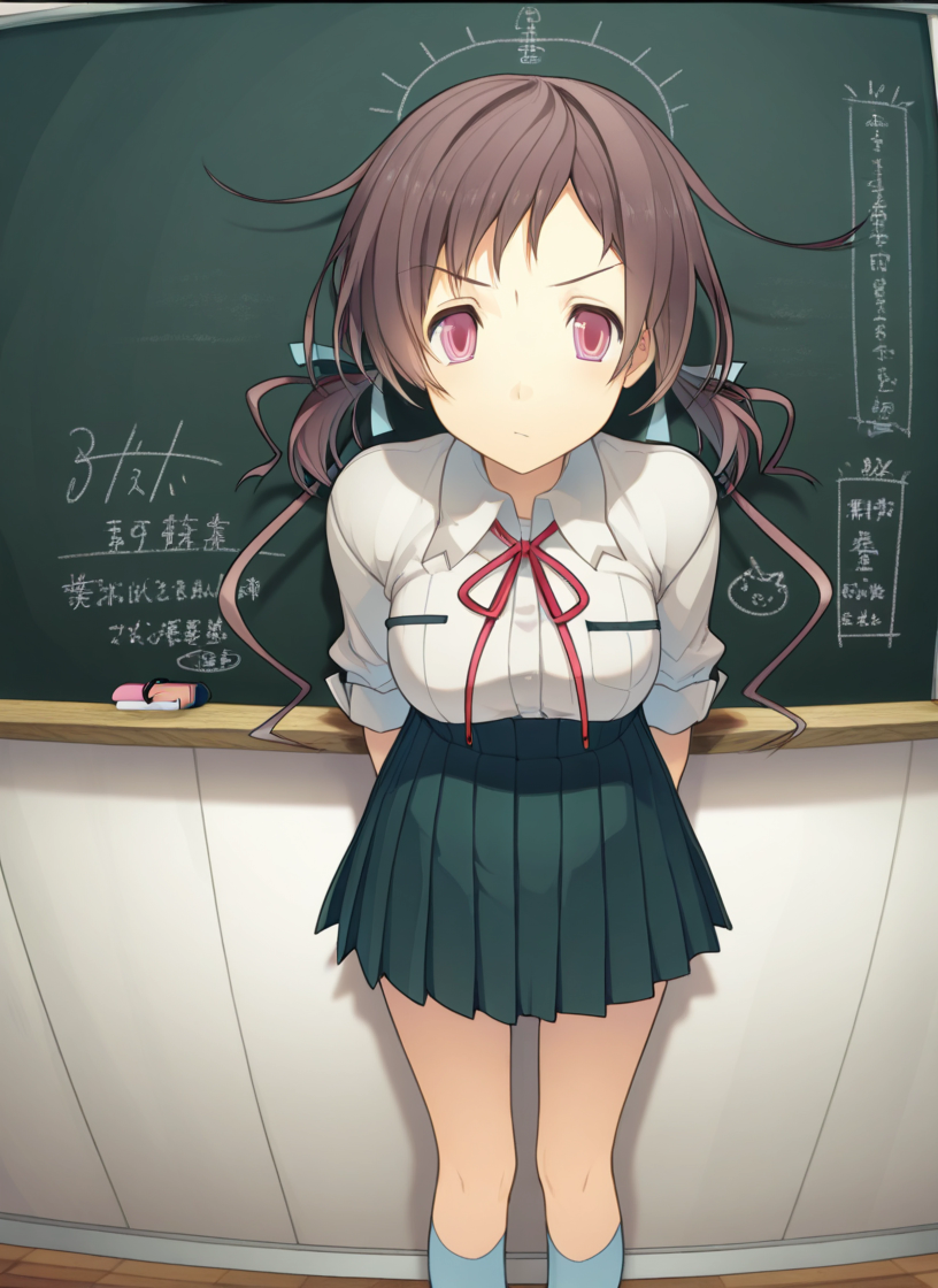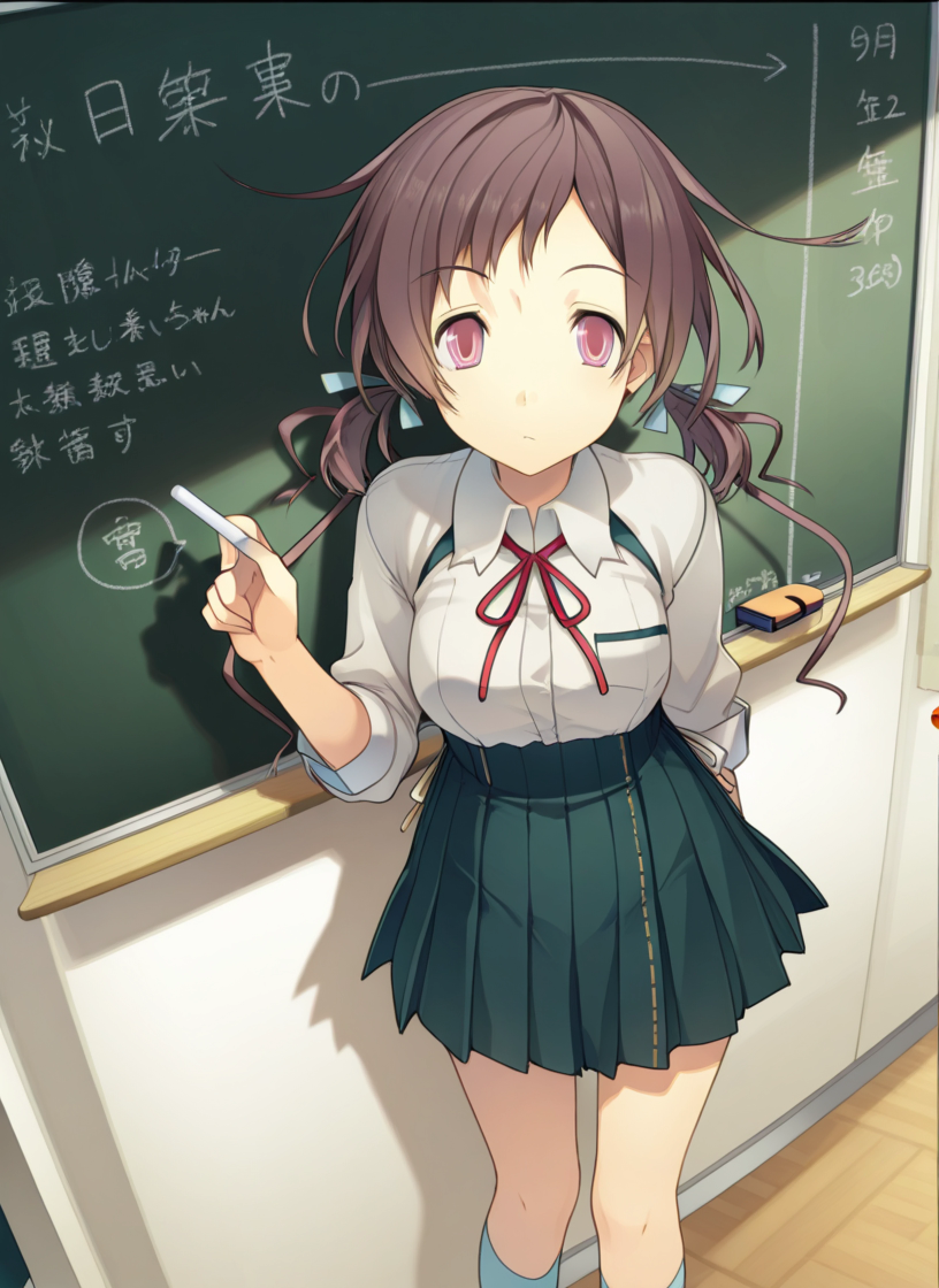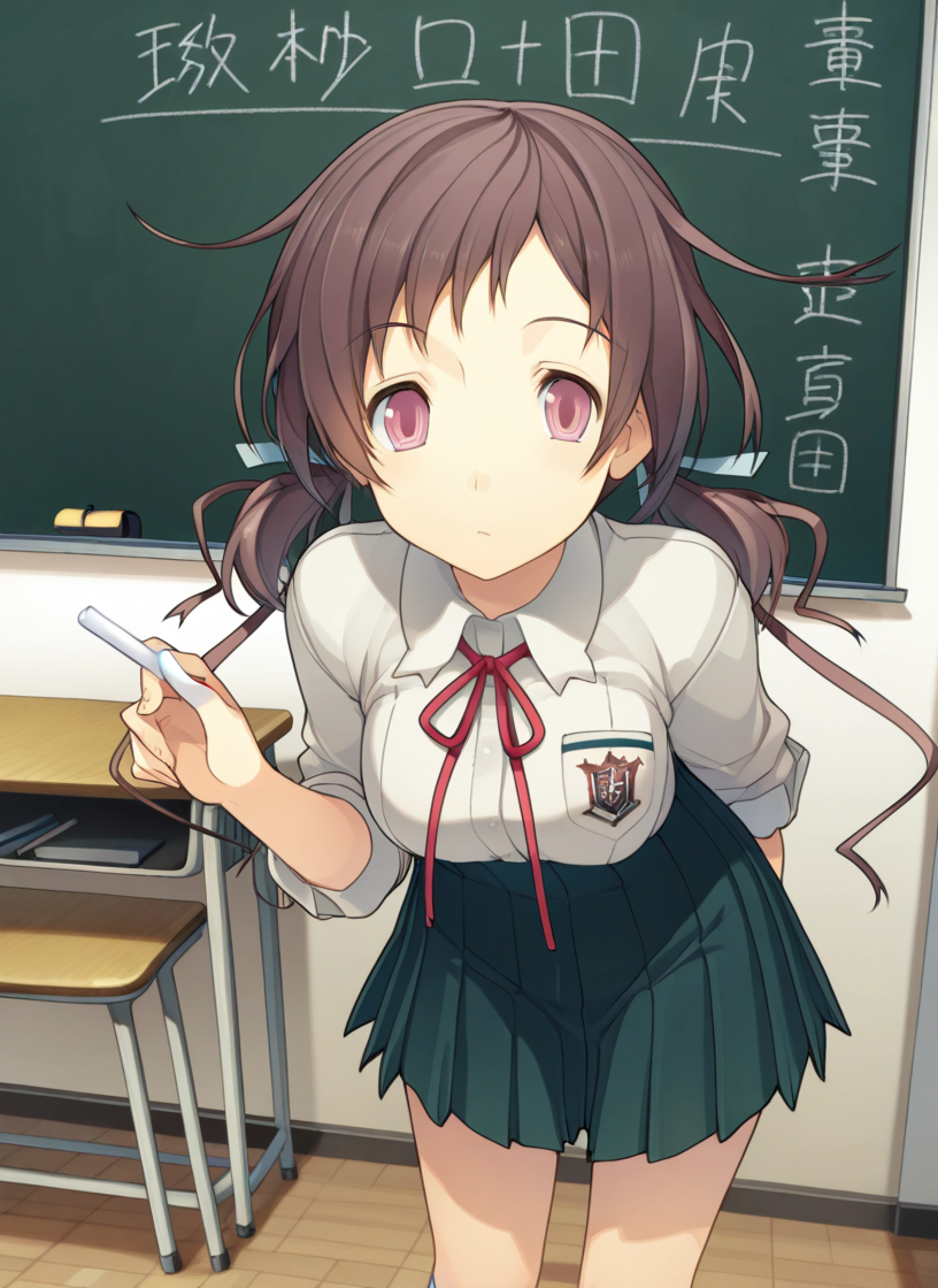 school uniform, gray collared shirt, sleeves bunched up, red bow, dark green skirt, white skirt trim, light blue socks, brown loafers